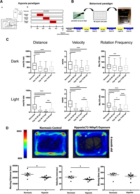 Hypoxia causes impaired motor behavior in larval and adult animals. A, Experimental set-up for hypoxia (a) and time line (b) of hypoxia exposure and analysis. B, Schematic of behavioral testing paradigm. C, Data plots show impaired motor behavior in hypoxia-exposed larvae, each point is a separate animal. Mean shown, ANOVA, ****p < 0.0001, ***p < 0.001. D, top, Heat-map of adult zebrafish (six-month-old) exposed to hypoxia (3- to 4-dpf 5% pO2) shows decreased swimming. Below, Hypoxia-exposed zebrafish have persistent decreases in velocity and distance swum as adults animals (normoxia n = 8, pre-hypoxia n = 10); *p < 0.05; SD shown).