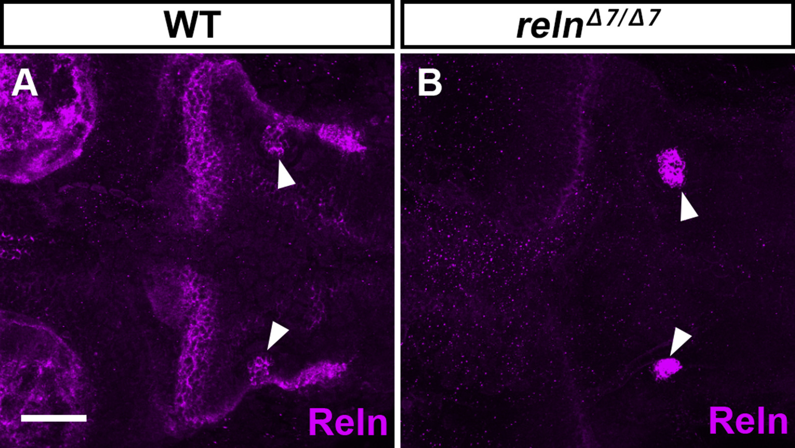 Specific detection of Reln protein by immunostaining. WT (A, n= 4) and relnΔ7/Δ7 (B, n= 3) larvae at 5-dpf were stained with anti-Reln (magenta) antibody. Dorsal views with anterior to the left. Typical images are shown. Note that Reln signals in and near the granule cell axons were severely decreased in the reln mutants. In some reln mutant larvae, nonspecific signals were also seen bilaterally in the hindbrain (marked by arrowheads). Scale bars: 100 μm in A.
