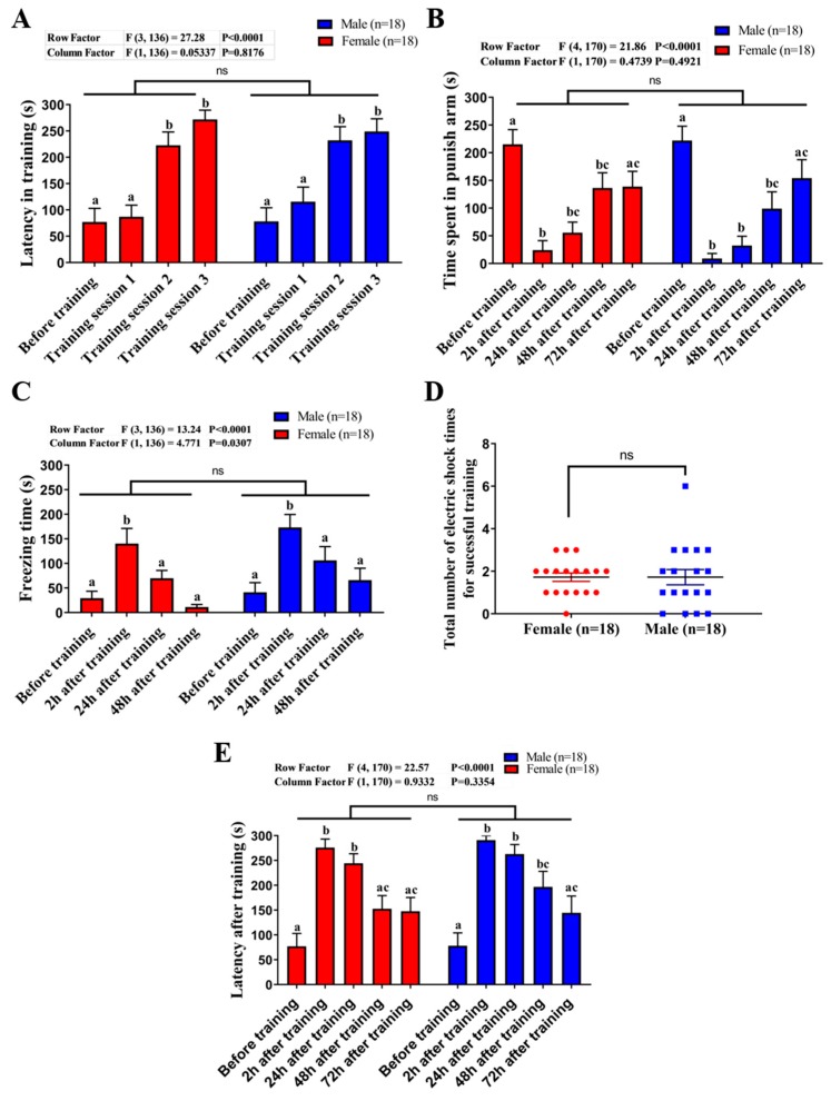 The assessment of the influence of gender on learning and memory in the T-maze test. (A) Comparison of the latency (s) for male (blue) and female (red) fish to swim into the punishment chamber for each training session. (B) Comparison of the time spent in punish arm (s) for male and female fish at different time points before and after training. (C) Comparison of the freezing time (s) for male and female fish at different time points before and after training. (D) Comparison of the total number of electric shock between male and female fish. (E) Comparison of the memory retention latency (s) for male and female fish at different time points after training. The data are expressed as means ± SEM. The data were analyzed by two-way ANOVA and followed with the Tukey–HSD test. Different letters (a, b, c) on the error bars represent significant differences (p < 0.05, n = 18).