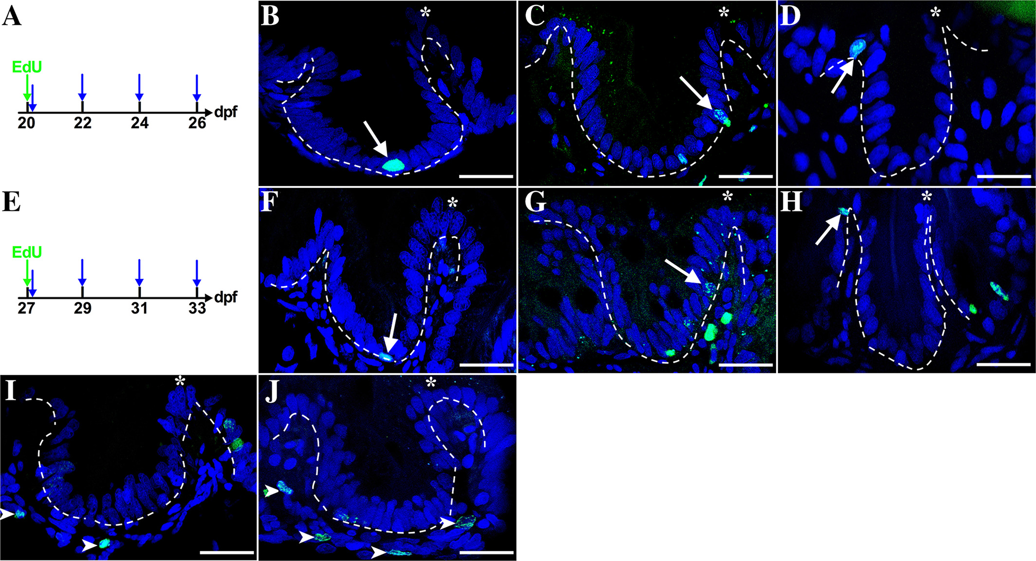 Fig. 9 A–J: Epithelial cells migrate up the folds during the third and the fourth week postembryogenesis. Individuals are injected with Edu (green arrow) either at 20 (A) or 27 (E) dpf. Samples are taken at 1 hr to determine initial cell position (first blue arrow, A and E) and then at 2‐day intervals to the end of the week (three additional blue arrows, A and E). With a pulse of Edu at either 20 dpf (A) or 27 dpf (D) epithelial cells are labeled only at the fold base (arrows). Following a chase for 2 days to either 22 (C) or 29 (G) dpf, progeny reach the mid‐fold (arrows) and reach the tip by 4 days at either24 (B) or 31 (E) dpf. In each of the histological panels, the dashed line is drawn between the epithelial and mesenchymal layers. During these 2 weeks, mesenchymal cells are also labeled (examples at 24 dpf‐C and 31‐F; mesenchymal cells indicated with arrowheads); n = 4.