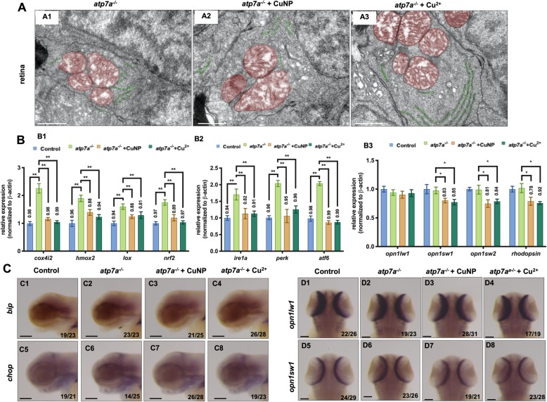 Retina development in atp7a−/− mutant treated with copper. A TEM analysis of retinal cells in copper-stressed atp7a−/− mutant embryos at 96 hpf. A1-A3, sagittal slides of retina, red color indicating mitochondria and green color indicating ER. B Quantitative PCR of ROS related genes (B1; cox4i2, hmox2, lox, and nrf2), UPR related genes (B2; ire1a, perk, and atf6), and retinal genes (B3; opn1wl1, opn1sw1, opn1sw2 and rhodopsin) in atp7a−/− mutants. C WISH assays of ER stress marker bip and chop in atp7a−/− mutants. D WISH assays of retinal marker (opn1wl1 and opn1sw1) in atp7a−/− mutants. C1-C8, lateral view, anterior to the left, D1-D8, dorsal view, anterior to the up. Scale bar: A1-A3, 1 μm; C1-C8 and D1-D4, 100 μm; **, P < 0.01; *, P < 0.05