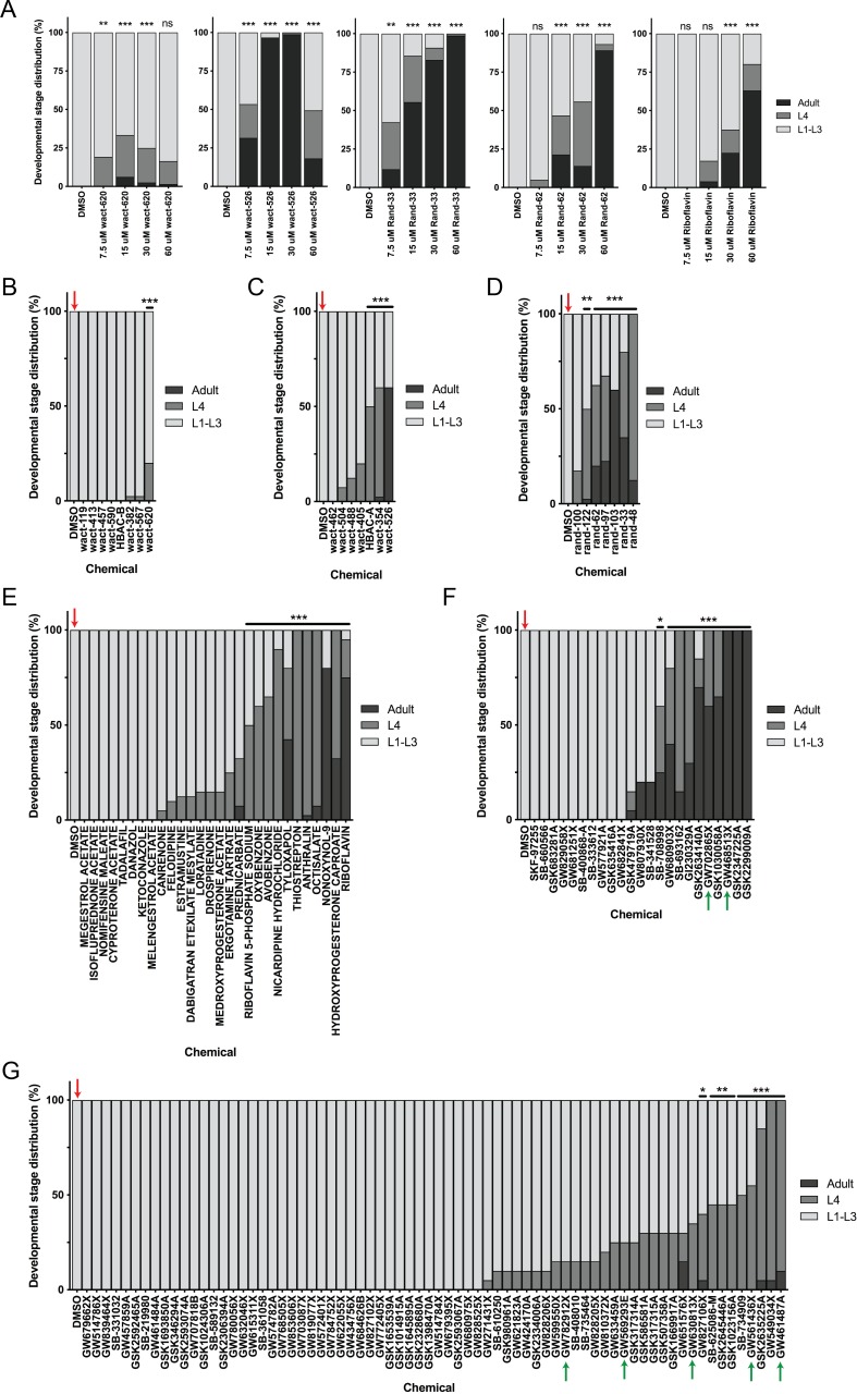 (A) Chemical dose-response re-testing of five compounds shows consistent ability to suppress nemadipine-A-induced growth arrest of unc-68 mutants. Note: wact-526 precipitated at 30 and 60 μM and rand-62 precipitated at 60 μM. (B–G) Post-hoc statistical analysis showing the developmental stage distributions of the 145 re-tested molecules from the primary screen, and identifying those that were significantly different from DMSO wells (red arrows). Again, it is important to note that this was performed while assuming that 20 worms were in each well as a means of estimating the proportion of actual L4 and adult counts in each well. In other words, we assumed #L1-L3 larvae = 20 – (#L4 + #adult). Plots shown are from independent screens of (B) 7.5 μM wactives, (C) 60 μM wactives, (D) 60 μM ‘random’ non-wactives, (E) 60 μM US Drug Collection and (F-G) 60 μM GlaxoSmithKline Published Kinase Inhibitor (PKI) set. In the PKI set, p38 inhibitors that suppressed growth arrest are highlighted by green arrows. Statistical analysis by Kruskal-Wallis test with Dunn’s multiple comparisons post-test where *p<0.05, **p<0.01, ***p<0.001.