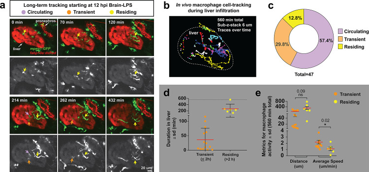 (a) Representative 3D images from six timepoints corresponding to Video 4 from a four dpf zebrafish which was brain-LPS injected and imaged starting at 12 hpi. Infiltrating macrophages can be classified into three groups (examples shown by arrows of different colors): circulating (present in only a single timepoint), transient (<2 hr) and residing cell (>2 hr). Double transgenic zebrafish labeling macrophages (mpeg1:GFP) and hepatocytes (fabp10a:DsRed) were used to track macrophage infiltration over a 10 hr period. Color overlay of both channels and single GFP channel in grayscale for macrophages are shown. LPS was co-injected with Alexa 568 conjugated dextran to validate brain injections and detect systemic distribution of the injected material based on labeling of the pronephros by the fluorescent dextran. Labeling of pronephros has been previously described after intravenous injection of a fluorescent tracer (Oltrabella et al., 2015), but labeling of proximal kidney tubules can also be observed in transgenic lines expressing a red fluorescent protein. (b) 2D projection of the tracking of infiltrating macrophages in the entire liver over all timepoints of analysis. Each traced cell is represented by a circle for its location at each timepoint if present in the liver, and a line for its movement between the timepoints. Different colors represent different cells. (c) Relative percentage of the different types of infiltrating macrophages based on liver occupation. n = 47 macrophages were tracked and analyzed. (d) Scatter plot shows the total duration of each traced infiltrating macrophage in the ‘transient’ and ‘residing’ groups. (e) Total distance and average speed of each macrophage in the ‘transient’ and ‘residing’ groups. Total distance was not significantly different, but the ‘transient’ macrophages moved faster with a significantly higher average speed than the ‘residing’ cells. sd, standard deviation; ns, not significant.