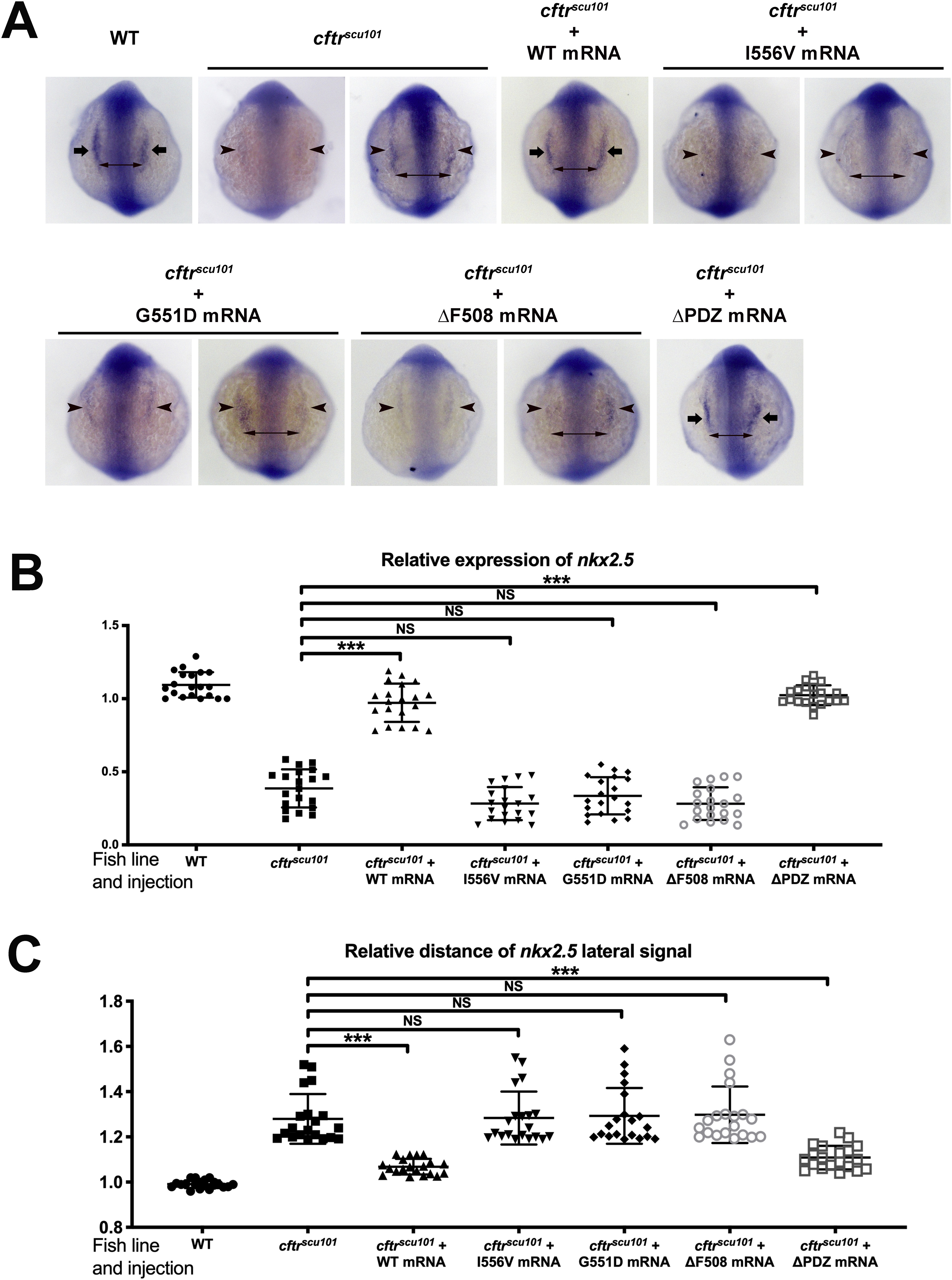 Fig. 4 Fig. 4. CFTR I556V mutants fail to rescue nkx2.5-expressing cardiac progenitor cells at the 8-somite stage (13 hpf) of embryogenesis. (A) Embryo orientations: dorsal view with anterior at the top. Arrows point to the normal nkx2.5 signal; arrowheads demonstrate the aberrant strength and position of nkx2.5 expression induced by cftr mutants; double-ended arrows indicate the distance between the two nkx2.5+ progenitor populations. Relative expression of nkx2.5 (B) and relative distance of nkx2.5 lateral signal (C) are represented in the scatter diagram.