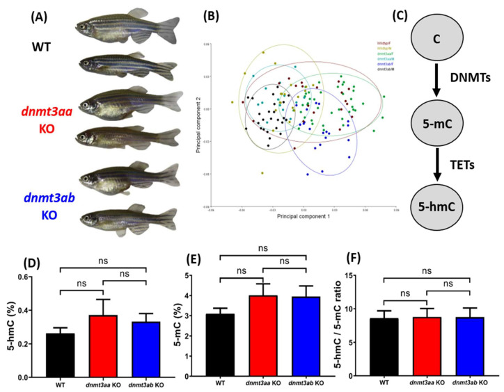 Morphometric and DNA methylation level comparison for wild types, dnmt3aa, and dnmt3ab gene knockout zebrafish. (A) Morphologies of six-month-old wild types, dnmt3aa, and dnmt3ab knockout zebrafish. Female fish is shown in the upper panel and male fish in the bottom panel. (B) Morphometric analysis of wild types, dnmt3aa, and dnmt3ab gene knockout zebrafish by principal component analysis (PCA) method. (C) Schematic diagram showing the biochemical pathway on key proteins involving cytosine DNA methylation. Comparison of 5-hmC (D), 5-mC (E), and 5-hmC/5-mC ratio (F) between wild types, dnmt3aa, and dnmt3ab knockout zebrafish. The data are expressed as the mean with S.E.M. and analyzed by one-way ANOVA followed by Fisher’s LSD post hoc test (n = 6 for wild type; n = 4 for dnmt3aa KO fish; n = 5 for dnmt3ab KO fish).
