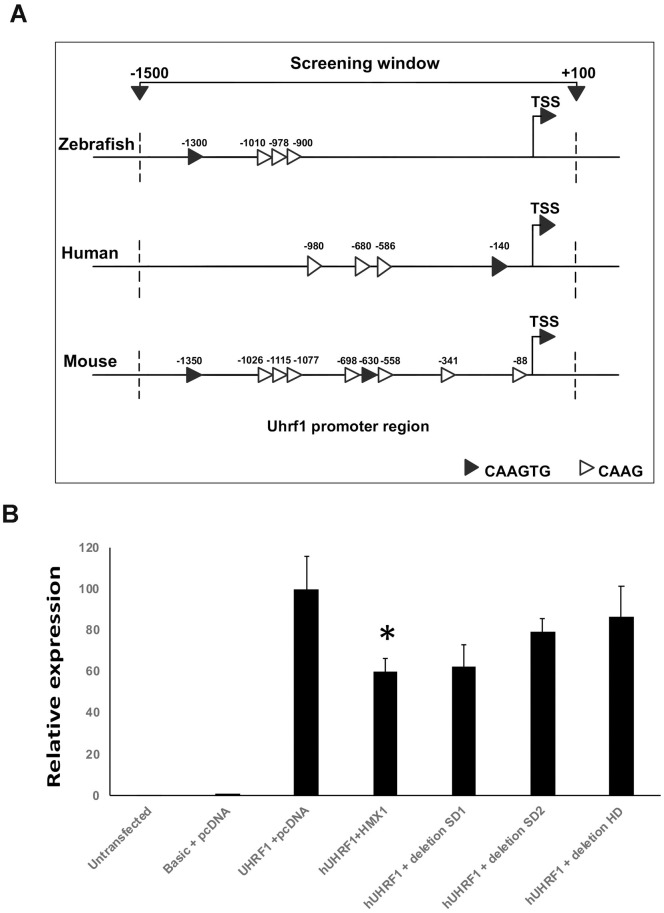 Schematic representation of the HMX1 predicted promoter region in zebrafish, human and mouse genomes (A). Note the presence of complete Hmx1 binding sites (CAAGTG) and the minimal binding core (CAAG). Activity of HMX1 on human UHRF1 promoter (B). The pGL3-Uhrf1 reporter plasmid was cotransfected with pcDNA3.1 empty, pcDNA3.1-Hmx1 expression vector, and pcDNA3.1-Hmx1 del SD1, del SD2, or del HD. HMX1 inhibits UHRF1 transcriptional activity by 40%. HMX1 del SD1, HMX1 del SD2 and HMX1 del HD had no statistical significant effect. Luciferase activity was normalized against β-galactosidase activity. Data are expressed as mean of three or more experiments. *; P<0.05 (ANOVA test).