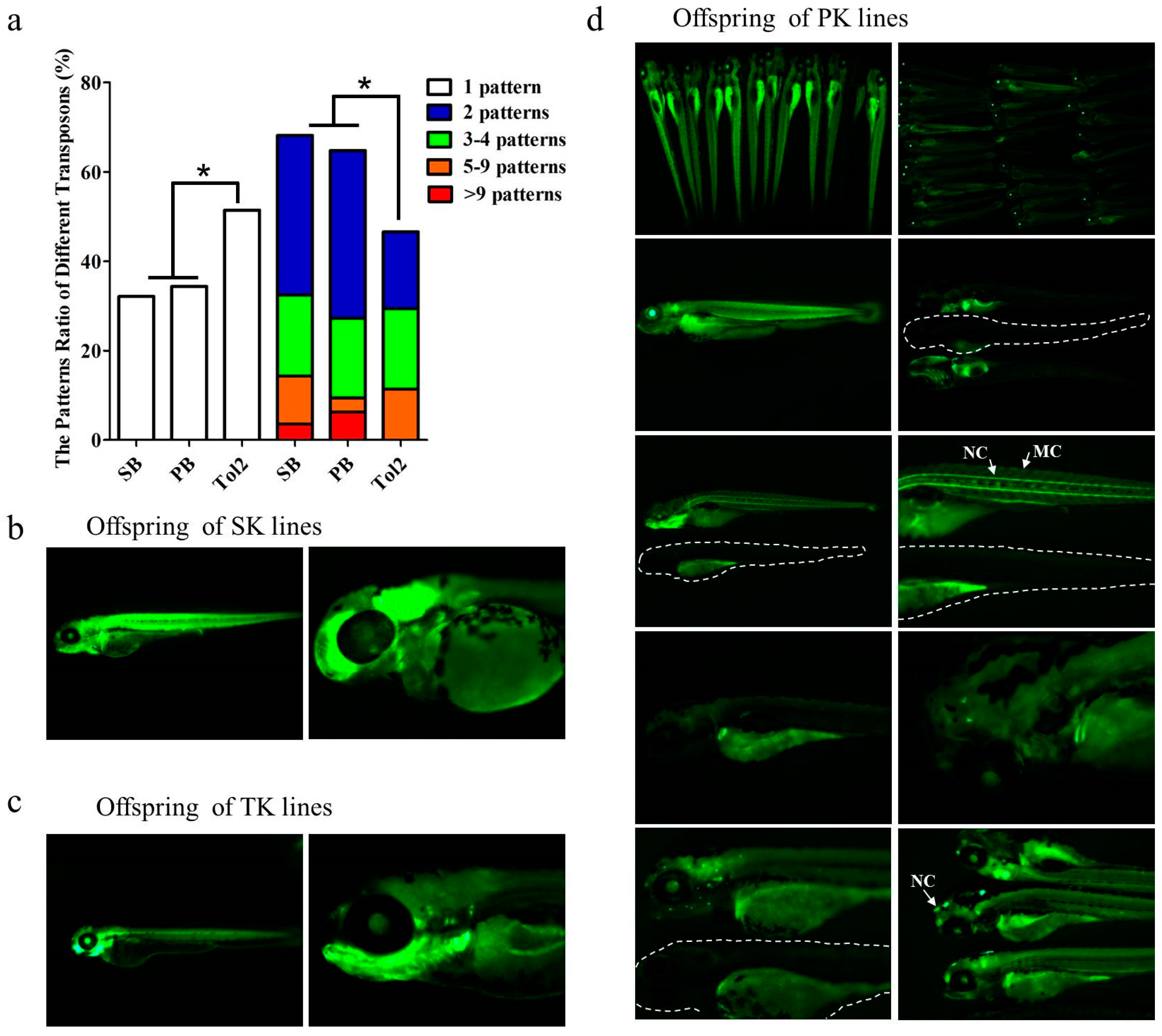 Fig. 2 ET pattern difference based on SB, PB and Tol2 transposons in zebrafish. (a) Pattern difference was measured by counting the different patterns of offspring at five days postfertilization (dpf) from each single founder. Significant difference was detected using a χ-squared test; asterisk indicates p < 0.05; (b–d) Offspring patterns of lines generated by SK (ET lines generated by the SB transposon), TK (ET lines generated by the Tol2 transposon), and PK (ET lines generated by the PB transposon). In various expression patterns, specific expression in tissues such as eyes, kidney tubes, muscles, and swim bladders could be detected, as well as specific expression patterns in various cells such as nerve cells (NC) and muscle cells (MC). White dotted lines in (d) indicate the WT fish.