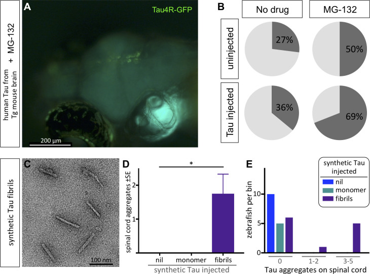 Injections of synthetic Tau fibrils into Tau4R-GFP zebrafish induced GFP+ puncta in brains and spinal cord. (A,B) Inhibiting the proteosome with MG-132 enhanced the percentage of larvae bearing GFP+ inclusions in the brain following injection of tau-laden brain homogenate. (C) Synthetic human Tau proteins were fibrillized as confirmed via EM analysis. Human Tau fibrils were microinjected into the larval hindbrain at 2 days post-fertilization, and Tau inclusions were analyzed at 3 days post injections. (D) Tau aggregates were only observed after injection of Tau fibrils, not monomers (*p=0.0104, Kruskal Wallis test). (E) Tau aggregates (same data as D, presented as distribution of larvae that displayed various amounts of GFP+ puncta) appear only after injection of Tau fibrils, not monomers.
