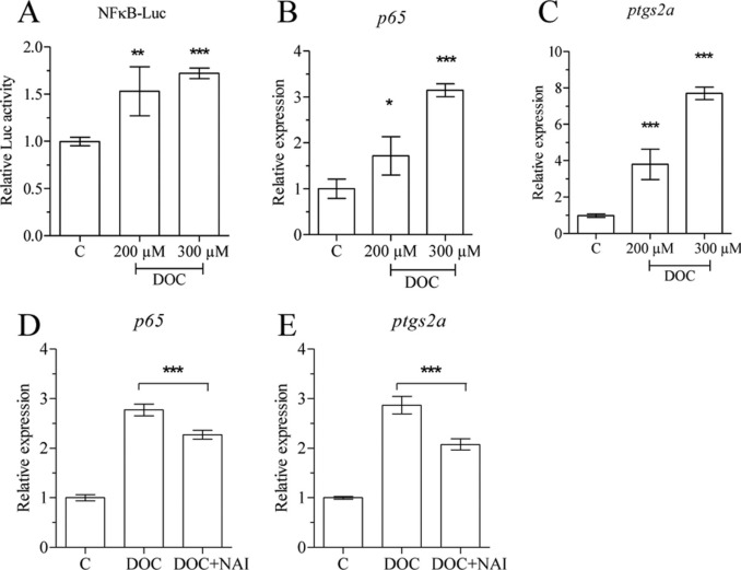 Fig. 5 FIGURE 5. DOC activates NFκB and up-regulates p65 and ptgs2a expression in vitro. nZFL were exposed to DOC (200 μm, 300 μm) for 12 h, and luciferase activity was analyzed to check NF-κB activation (A). ZFL cells were exposed to DOC (200 μm, 300 μm) alone and combination (200 μm DOC) with NAI (40 nm) for 24 h, and total RNA was extracted followed by qRT-PCR analysis of p65 (B and D) and ptgs2a (C and E) expression. The statistically significant difference between groups was determined using Student's t test (*, p < 0.05; **, p < 0.01; ***, p < 0.001). n = 4. Error bars represent the mean ± S.D.