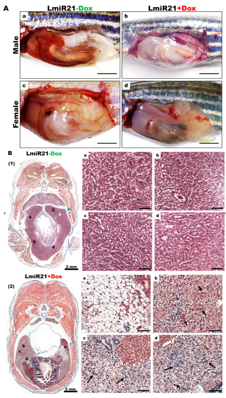 Development of nonalcoholic steatohepatitis (NASH) phenotypes in LmiR-21 zebrafish at 6 mpf. (A) Gross liver images of (a) LmiR21 − Dox male, (b) LmiR21 + Dox male, (c) LmiR21 − Dox female, (d) LmiR21 + Dox female. Scale bar: 3 mm. (B) Representative images of Masson’s trichrome staining of steatohepatitis in livers of (1) LmiR21 − Dox (insets a-d) and (2) LmiR21 + Dox; Insets: (a) hepatocyte ballooning, (b) Mallory-Denk bodies (MDBs) are indicated by arrows, and (c,d) lobular inflammation is indicated by arrows. Scale bar: 50 μm. (C) Representative images of Masson’s trichrome staining of fibrotic liver tissue from LmiR21 + Dox; Insets: (a,b) MDBs concomitant with fibrosis (red arrows) and scar tissue associated with liver fibrosis (yellow arrows) and (c,d) lobular inflammation concomitant with blue collagen (blue arrows). Scale bar: 50 μm. (D) Induction of proinflammatory gene expressions in response to inflammation was significantly greater in LmiR21 + Dox than in controls (n = 3). Statistically significant differences from LmiR21 − Dox were denoted by * (p < 0.05), ** (p < 0.01).