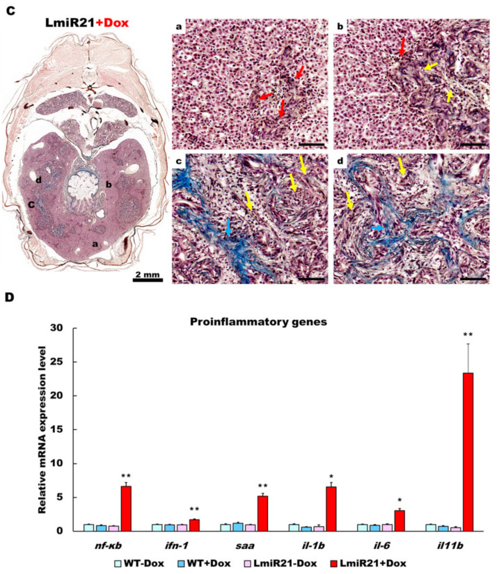 Development of nonalcoholic steatohepatitis (NASH) phenotypes in LmiR-21 zebrafish at 6 mpf. (A) Gross liver images of (a) LmiR21 − Dox male, (b) LmiR21 + Dox male, (c) LmiR21 − Dox female, (d) LmiR21 + Dox female. Scale bar: 3 mm. (B) Representative images of Masson’s trichrome staining of steatohepatitis in livers of (1) LmiR21 − Dox (insets a-d) and (2) LmiR21 + Dox; Insets: (a) hepatocyte ballooning, (b) Mallory-Denk bodies (MDBs) are indicated by arrows, and (c,d) lobular inflammation is indicated by arrows. Scale bar: 50 μm. (C) Representative images of Masson’s trichrome staining of fibrotic liver tissue from LmiR21 + Dox; Insets: (a,b) MDBs concomitant with fibrosis (red arrows) and scar tissue associated with liver fibrosis (yellow arrows) and (c,d) lobular inflammation concomitant with blue collagen (blue arrows). Scale bar: 50 μm. (D) Induction of proinflammatory gene expressions in response to inflammation was significantly greater in LmiR21 + Dox than in controls (n = 3). Statistically significant differences from LmiR21 − Dox were denoted by * (p < 0.05), ** (p < 0.01).