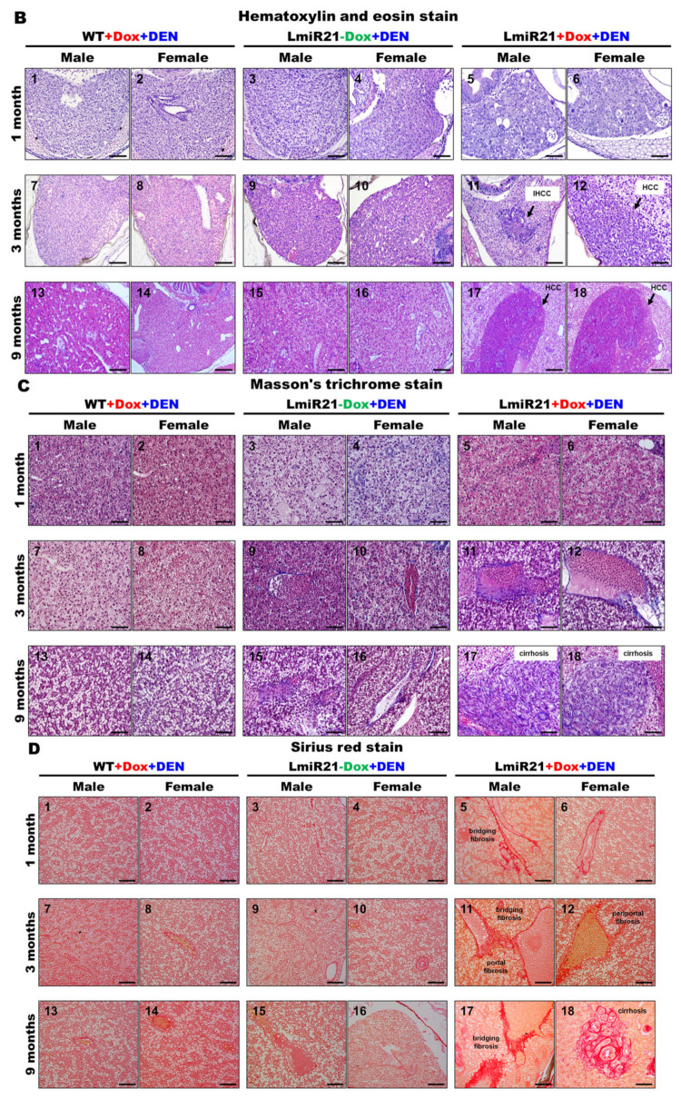 Increased susceptibility of LmiR21 zebrafish to diethylnitrosamine (DEN)-induced liver fibrosis and carcinogenesis. (A) Experimental design of three independent DEN treatments and doxycycline (Dox) dosing. (B) Representative images of livers with microscopic tumors identified following hematoxylin & eosin staining (indicated with arrows) one, three, and nine months after DEN treatment. Scale bar: 100 μm. (C) Representative images of livers with microscopic injuries identified by Masson’s trichome staining at one, three, and nine months after DEN treatment. Scale bar: 50 μm. (D) Representative images of livers with microscopic injuries identified by Sirius red staining at one, three, and nine months after DEN treatment. Scale bar: 50 μm.