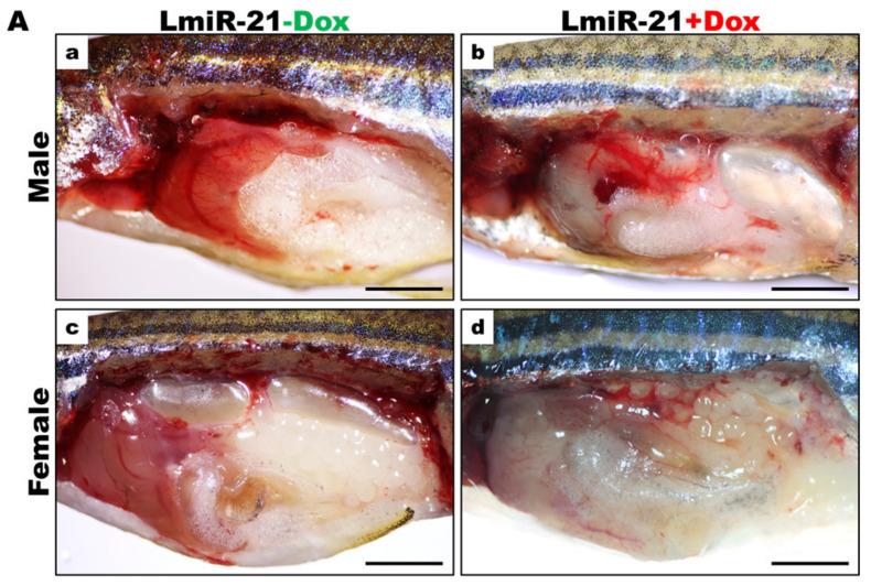 LmiR21 zebrafish develop nonalcoholic hepatocellular carcinoma (NAHCC) phenotypes at 10 months post fertilization (mpf). (A) Gross liver images from (a) LmiR21 − Dox male, (b) LmiR-21 + Dox male, (c) LmiR21 − Dox female, and (d) LmiR21 + Dox female. Scale bar: 3 mm. (B) Microscopic views of angiogenesis in livers from bright field: (a) LmiR21 − Dox (c) LmiR21 + Dox and corresponding GFP fluorescence images (b) LmiR21 − Dox (d) LmiR21 + Dox. Scale bar: 2 mm. (C) Hematoxylin & eosin stained livers from (1) LmiR21 − Dox (insets ad) (2) LmiR21 + Dox (insets ad) of steatohepatitis concomitant with HCC: hepatocyte ballooning, Mallory−Denk bodies (MDB), lobular inflammation and HCC (indicated by arrows). Scale bar: 50 μm. (D) Masson’s trichrome stained livers of (1) LmiR21 − Dox (insets ad), (2) LmiR21 + Dox (insets ad) indicative of steatohepatitis, portal and periportal fibrosis concomitant with HCC and (3) LmiR21 + Dox (insets ad) indicative of steatohepatitis, advanced fibrosis (cirrhosis) concomitant with HCC. Scale bar: 50 μm. (E) Analysis of selected miR-21 targeted NAHCC associated genes: HMG-box transcription factor 1 (hbp1), 3-hydroxy-3-methylglutaryl-CoA reductase (hmgcr), fatty acid binding protein 7a (fabp7a), programmed cell death 4b (pdcd4b), and tissue inhibitors of metalloproteinases 3 (timp3). (1) Schematic alignment between the mature miR-21 seed sequence and the mRNA target sequence at the 3′ UTR. (2) Whole mount in situ hybridization assays demonstrate that miR-21 significantly represses expression of NAHCC associated genes in AmiR21 fish. Scale bar: 1 mm. (3) RT-qPCR analysis of the NAHCC associated genes mRNA expression in the liver of WT ± Dox and LmiR21 ± Dox at 10 mpf. Statistically significant differences from LmiR21 − Dox were denoted by ** (p < 0.01) and *** (p < 0.001).