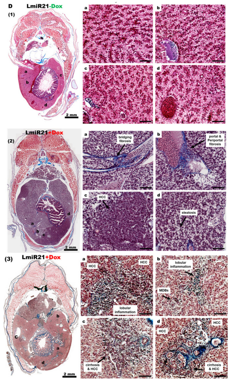 LmiR21 zebrafish develop nonalcoholic hepatocellular carcinoma (NAHCC) phenotypes at 10 months post fertilization (mpf). (