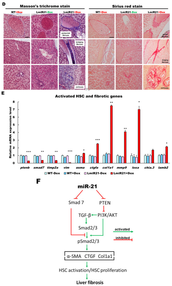 Figure 5 MiR-21 targets smad7 and ptenb in hepatocytes and leads to fibrogenesis. (A) Schematic alignment between the mature miR-21 seed sequence (red) and the smad7 mRNA target sequence (blue) at the 3-UTR. Perfect matches are indicated by a line, and G:U pairs by a colon. Whole mount in situ hybridization assays show significant repression of smad7 mRNA by miR-21 in AmiR+Dox, as compared to AmiR21 − Dox. Scale bar: 1 mm. (B) RT-qPCR analysis of smad7 and ptenb mRNA expression in the liver of WT ± Dox and LmiR21 ± Dox fish at 8 mpf. (C) Representative Western blots of Smad7 and PTEN in livers of WT ± Dox and LmiR21 ± Dox at 8 mpf. (D) Representative images of Masson’s trichrome and Picrosirius red staining of liver tissue from WT±Dox and LmiR21 ± Dox at 8 mpf depicting the individual components of advanced fibrosis (as indicated): portal and periportal fibrosis, bridging fibrosis and cirrhosis. Scale bar: 50 μm. (E) Increased expression of HSC and fibrotic genes in response to Smad7 and PTEN suppression was significantly greater in LmiR21 + Dox at 8 mpf than controls (n = 3). (F) Bilateral-factorial effects of miR-21 in fibrogenesis activation. Statistically significant differences from LmiR21 − Dox are denoted by * (p < 0.05), ** (p < 0.01) and *** (p < 0.001) for panels B, C and E.
