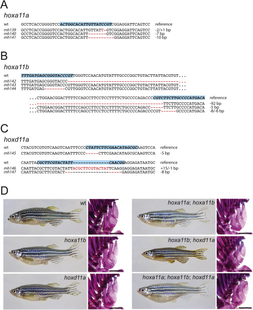 Figure S5. CRISPR-generated hox11 loss-of-function mutants, related to Figure 6 Mutant lines of hox11 paralogs. (A) hoxa11a (B) hoxa11b (C) hoxd11a generated by CRISPR-Cas9 targeted gene editing. Shown is the targeted wild-type sequence as well as the sequence for the generated mutant alleles (blue box indicates guide target sequence). (D) Representative singular and compound mutants. All mutant combinations are viable and fertile. Scale bars 500 μm.