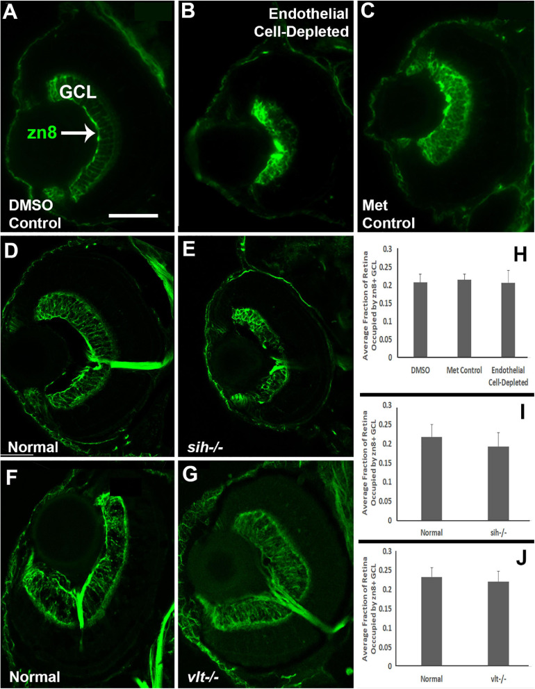 Retinal ganglion cells in cardiovascular disruption model systems. (A,C) Cryosections of doubly-transgenic (cdh5:gal4; UAS:nfsB-mCherry), DMSO-treated (DMSO Control; (A); Met-treated (Endothelial Cell-Depleted; (B); and Met-treated clutchmates (Met Control; (C) at 72 hpf, stained with zn8, which labels DM-Grasp/Neurolin/Alcama, present on neurons growing long axons, and more weakly expressed in neuroepithelial cells. Control retinas show a well-defined layer of retinal ganglion cells within the ganglion cell layer (GCL) (A, arrow), while endothelial cell-depleted retinas display a reduced and disorganized GCL (B). (D,E) Cryosections of normal clutchmates (D) and sih-/- embryos (E) at 72 hpf, stained with zn8. Normal retinas show a clearly stained zn8+ GCL (D) and sih–/– retinas also show clear staining, with the GCL apparently reduced in thickness and slightly disorganized (E). (F,G) Cryosections of normal clutchmates (F) and vlt–/– embryos (G) at 72 hpf, stained with zn8; the GCL of vlt–/– retina appears normal. (H,J) Quantification of fraction of retina occupied by the GCL (GCL/retina ratio), in retinas of endothelial cell-depleted vs. control embryos (H; p < 0.814, Kruskal-Wallis test, post hoc analysis not justified; n = 7 DMSO controls, 8 Met controls, 10 endothelial cell-depleted), sih–/– vs. normal siblings (I; p = 0.147, Mann-Whitney test; n = 12 normal, 11 sih–/–), and vlt–/– vs. normal siblings (J; p = 0.459, Mann-Whitney test; n = 13 normal, 21 vlt–/–). Scale bar (in A, applies to all) = 50 μm.
