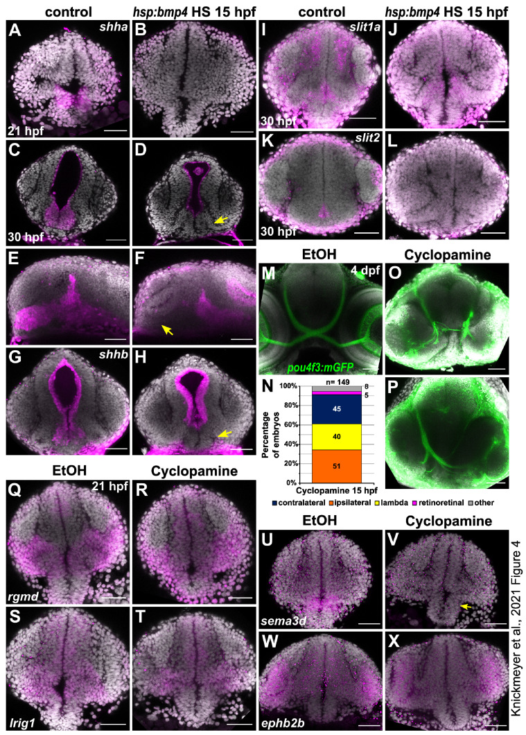Figure 4 Sonic hedgehog expression is locally inhibited by bmp4 induction and inhibition of Shh signaling results in defective RGC projections. (A–L) In situ hybridization in tg(hsp70l:bmp4) embryos and controls heat shocked at 15 hpf. (A,B) shha expression at 21 hpf in the diencephalon is inhibited by bmp4. (C–F) shha expression at 30 hpf in the anterior domain of the diencephalon (arrow) is inhibited by bmp4. (G,H) shhb expression at 30 hpf in the diencephalon (arrow) is inhibited by bmp4. (I,J) midline slit1a expression at 30 hpf is not changed by bmp4. (K,L) slit2 expression at 30 hpf is inhibited by bmp4. (M–P) RGC projection phenotypes in tg(pou4f3:mGFP) embryos treated with Cyclopamine. (M) Ethanol control. (N) Chart showing the distribution of RGC phenotypes in embryos treated with 100 µM Cyclopamine. Controls had exclusively contralateral projections (n = 61). (O) Ipsilateral RGC projections and (P) unilateral innervation of an optic tectum (“lambda”) in treated embryos. (Q–X) In situ hybridization in (R,T,V,X) embryos treated with 100 µM Cyclopamine and (Q,S,U,W) controls treated with ethanol. (Q,R) Expression of rgmd, (S,T) lrig1. (U,V) Expression of sema3d in the anterior diencephalon is sensitive to Cyclopamine treatment (arrow). (W,X) Expression of ephb2b. All images are maximum intensity projections, DAPI counterstaining, transverse view (except E,F, sagittal view). Scale bars 50 µm.