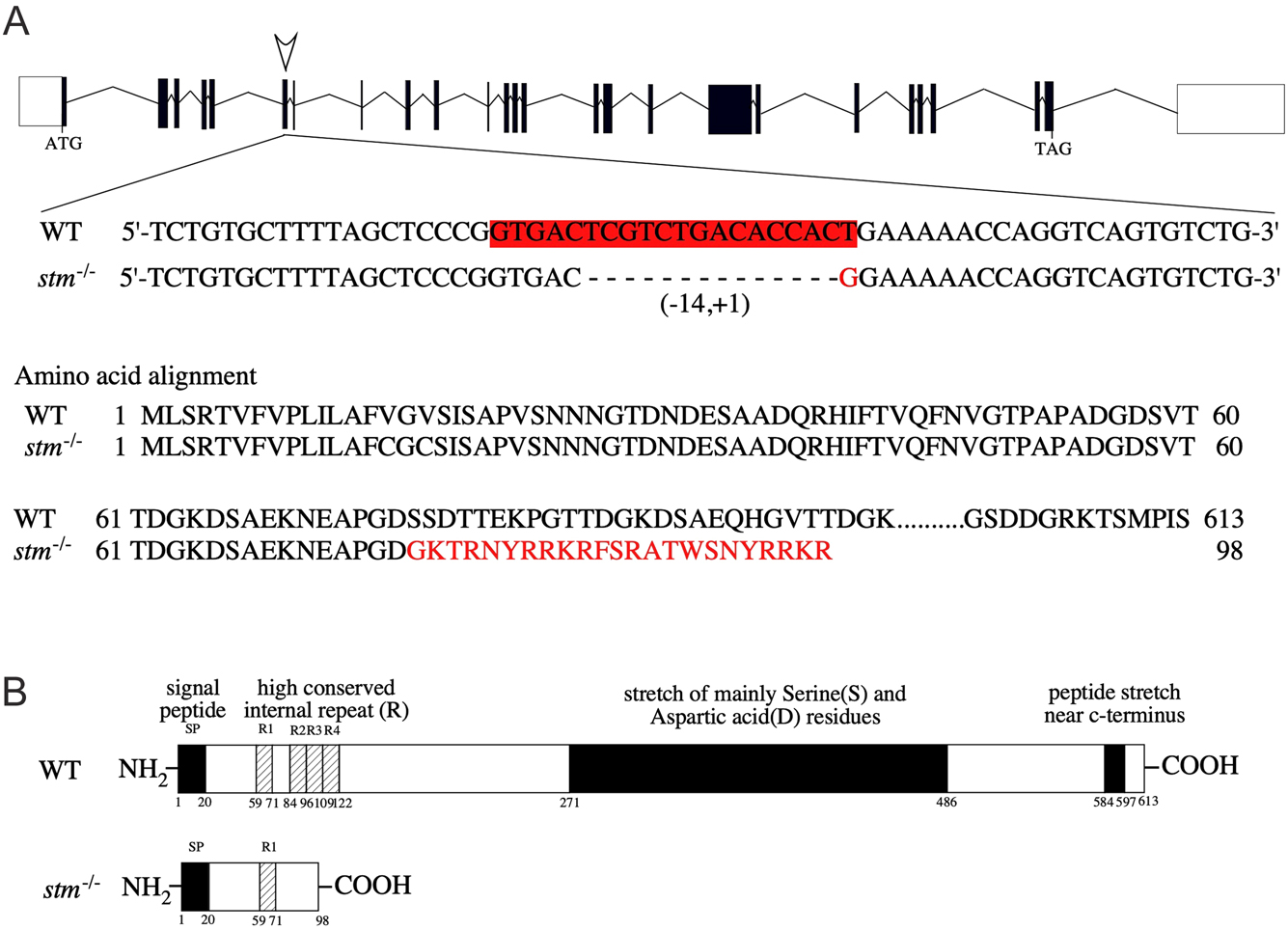 Fig. 1 DNA sequence and predicted protein structure of an established stm gene-edited strain. (A) Genome structure and DNA sequence of the target site for the genome editing of stm. DNA sequences around the target site (in red) for CRISPR/Cas9 digestion in WT and stm−/− mutants are indicated. A 14-nucleotide deletion and 1-nucleotide insertion were induced in the target site in the selected mutant. (B) The predicted protein structures of the WT and the stm−/− mutant are indicated. It is expected that a peptide of 98 amino acids in length with an N-terminal 76-amino acid sequence is the same as WT Stm and is produced in the stm−/− mutant. Thus only first high conserved internal repeat (R1) is present in Stm protein produced in the stm−/− mutant.
