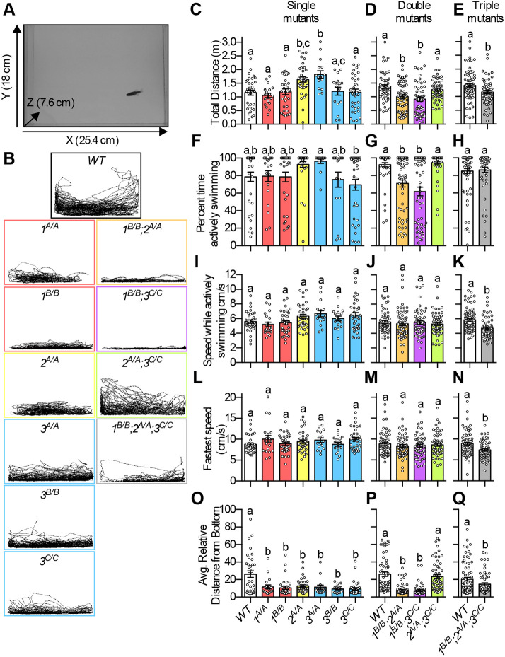 Zebrafish mbnl mutants exhibited altered movement. (A) Example still image taken from video of swim tests. Software was used to track the center of mass of each fish in the X and Y directions over 5 min. (B) Representative traces of individual fish of each genotype taken during the swim tests. x- and y-axes are the same as in A. mbnl1 mutant alleles are denoted as 1A and 1B, mbnl2 alleles as 2A, and mbnl3 alleles as 3A, 3B and 3C. (C-E) Total distance that adult WT and single (C), double (D) and triple (E) homozygous mbnl mutant fish swam during a 5-min swim test. (F-H) Percentage time actively swimming during the 5-min swim test for single (F), double (G) and triple (H) homozygous mbnl mutant fish. Pauses in swimming were removed from the data set, defined as at least 20 consecutive frames (2 s total) with no speed measurement greater than 1.5 cm/s. (I-K) Speed in cm/s during periods of active swimming during the 5-min swim test for single (I), double (J) and triple (K) homozygous mbnl mutant fish. (L-N) Fastest speed in cm/s, defined as the fastest 100 consecutive frames (10 s total) during the 5-min swim test, for single (L), double (M) and triple (N) homozygous mbnl mutant fish. (O-Q) Average relative distance from the bottom of the tank of fish during the 5-min swim test for single (O), double (P) and triple (Q) homozygous mbnl mutant fish. Zero represents the bottom of the tank and 100 represents the top of the tank. In C-Q, each dot represents one fish and data are presented as mean±s.e.m. In C,D,F,G,I,J,L,M,O,P, data were analyzed by ordinary one-way ANOVA with Tukey's multiple comparisons test; in E,H,K,N,Q, data were analyzed by an unpaired Student's t-test. Data bars that do not share the same letter above them are significantly different from one another. Raw data and statistical analysis details are in Table S5.