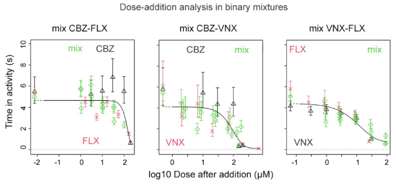 Figure 5 Dose–response mixture effects on swimming activity in zebrafish embryos upon exposure to a mixture of CBZ and FLX, CBZ and VNX, and VNX and FLX. The reference compound (black triangles/lines) is combined with the second compound (red crosses/lines); green diamonds/lines represent the corresponding mixtures. Doses of the second compound and of the mixtures are scaled to the reference compound. The mixtures do not deviate systematically from the overall fit, indicating that the combined effect results from dose addition.