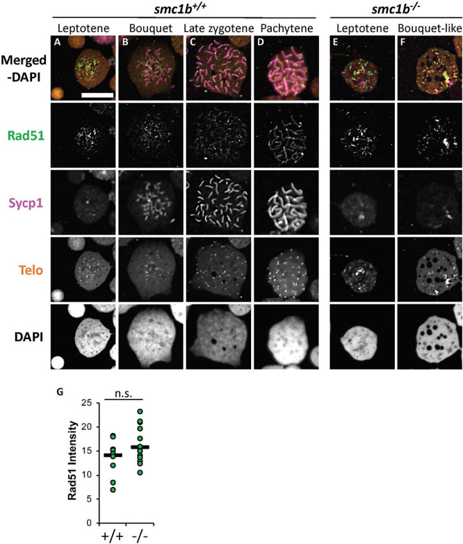 DNA double strand break and recombination marker Rad51 was expressed in smc1bQ198X mutant spermatocytes. Immunolabeling of Rad51 (green) and Sycp1 (magenta) in wild-type and mutant spreads, combined with telomere (telo) in situ hybridization (orange). (A,B) Rad51 protein was detected in wild-type beginning in leptotene stage and was initially located near the chromosome ends in leptotene and bouquet stages. (C,D) In more advanced wild-type spermatocytes, Rad51 localization become more distinct and resolved to one or two spots per chromosome. (E,F) Mutant spermatocytes had detectable levels of Rad51. (G) Quantification of Rad51 signal in wild-type (N = 10) and mutant (N = 15) leptotene stage cells demonstrates there is no significant difference (P = 0.0614). The horizontal bars show the medians. Scale bar is 10 μm.