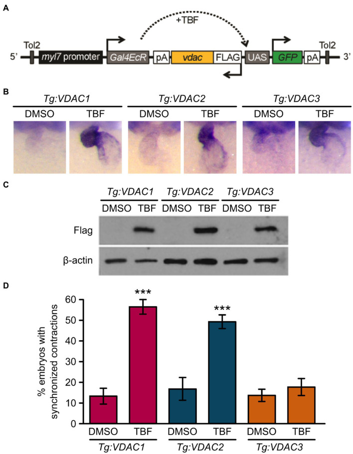 Induction of VDAC1 and VDAC2 but not VDAC3 expression restores rhythmic cardiac contraction in transgenic tremblor/ncx1h lines. (A) Schematic diagram of VDAC transgenic construct. The cardiomyocytes-specific promoter myl7 drives Gal4-ecdysone receptor fusion protein (Gal4EcR), which becomes transcriptionally activated in response to tebufenozide (TBF), an ecdysone receptor agonist and binds to the upstream activating sequence (UAS), resulting in the simultaneous expression of both FLAG-tagged VDAC and EGFP. Transgenic lines were bred in the tremblor/ncx1h background. (B) Whole-mount in situ hybridization analysis demonstrating that VDAC expression is induced specifically in the heart upon TBF treatment in transgenic zebrafish (Tg:VDAC). Embryos were treated with either DMSO or TBF from 24 hpf until they were fixed for in situ hybridization at 48 hpf. (C) Western blotting of 32 hpf transgenic embryo lysate with an anti-FLAG antibody showing that VDAC protein expression is induced after embryos are treated with TBF. β-actin was used as a loading control. (D) While only 13.5 ± 3.6% of DMSO-treated Tg:VDAC1; tremblor/ncx1h embryos exhibit rhythmic cardiac contraction (N = 3, n = 233), 56.72 ± 3.5% of TBF-treated Tg:VDAC1; tremblor/ncx1h embryos established rhythmic contraction (N = 3, n = 238). Similarly, as opposed to only 16.8 ± 5.7% of DMSO-treated Tg:VDAC2; tremblor/ncx1h embryos (N = 3, n = 161), 49.6 ± 3.1% of TBF-treated Tg:VDAC2; tremblor/ncx1h embryos showed cardiac contraction (N = 3, n = 227). In contrast, the effect of TBF-induced overexpression is minimal in Tg:VDAC3; tremblor/ncx1h (13.7 ± 2.9%, N = 3, n = 283 in DMSO-treated embryos compared to 17.9 ± 4.0%, N = 3, n = 373 in TBF-treated embryos). Overall rescue percentages represent the mean rescue percentage ± s.e.m. from N independent experiments, using a total of n embryos.