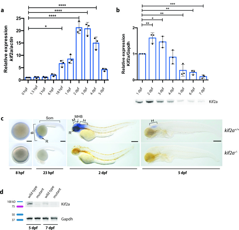 Expression and localization pattern of kif2a in the developing zebrafish. a, qPCR analysis of kif2a levels in kif2a+/+ larvae normalized to actin and represented as the fold change expression to 0 hpf. Values are reported as the mean ± SEM of three separate experiments. Significant values are noted as ****p ≤ 0.0001 and *p ≤ 0.05. b, Relative quantification of Kif2a protein expression in kif2a+/+ larvae of 1–7 dpf normalized to Gapdh and represented as the fold change expression to 1 dpf. Values are reported as the mean ± SEM of three separate experiments. Significant values are noted as ***p ≤ 0.001, **p ≤ 0.01, and *p ≤ 0.05. Below the graph is a representative Western blot image of Kif2a protein expression levels in kif2a+/+ larvae of 1–7 dpf. c, Spatiotemporal expression patterns of kif2a by whole-mount RNA in situ hybridization at 8 hpf, 23 hpf, 2 dpf, and 5 dpf. B, Brain; H, hindbrain; M, midbrain; MBH, midbrain–hindbrain boundary; Som, somite; R, retina. Scale bar, 200 μm. d, Representative Western blot image of Kif2a protein expression levels comparing kif2a+/+ with kif2a−/− larvae at 5 and 7 dpf.