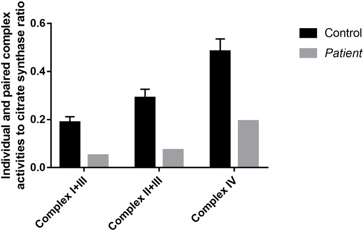 Electron transport chain paired and individual complexes in muscle biopsy specimen are depicted, which shows decreased paired and individual complex activities in Patient 1 compared to controls.