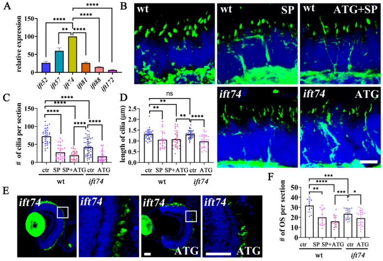 Maternal Ift74 contributes to the slow photoreceptor degeneration. (A) qRT-PCR results showing relative expression level of ift-b genes in one-cell stage embryos. The expression of the ift74 gene was set as 100%. (B) Confocal images showing photoreceptor connecting cilia in the retinae of 5 dpf wild-type, ift74 morphants, and mutant larvae. Cilia were stained with anti-acetylated alpha tubulin antibody (green). (C,D) Dot plots showing the number and length of connecting cilia in different groups as indicated. (E) Confocal images showing rod outer segments visualized with zpr-3 antibody in 5 dpf ift74 mutants injected with control or ATG morpholino as indicated. Enlarged views of the boxed area are shown on the right. (F) Statistical results showing the number of outer segments per retina section in different groups as indicated. Scale bars: B, 5 µm; E, 30 µm. * p < 0.05, ** p < 0.01, *** p < 0.001, **** p < 0.0001, ns, no significant.