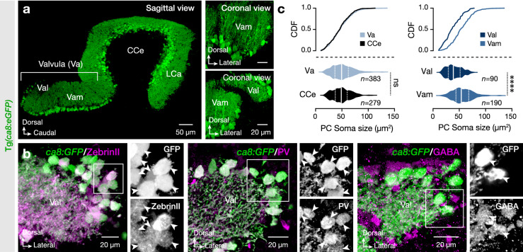 Expression pattern and specificity of Ca8:eGFP in the Purkinje cells of valvula cerebelli. (a) Sagittal and coronal sections show the specificity of the eGFP expression in all Purkinje cells (green) of the adult zebrafish cerebellum. (b) All eGFP-expressing Purkinje cells (green) are ZebrinII, PV, and GABA positive (magenta). Arrowheads indicate double-labeled cells. (c) Regionalized quantification of the Purkinje cell soma size in the adult zebrafish cerebellum. CCe corpus cerebelli, CDF cumulative distribution frequencies, GABA γ-aminobutyric acid, LCa lobus caudalis cerebelli, GFP green fluorescent protein, PC Purkinje cell, PV parvalbumin, Va valvular cerebelli, Val lateral part of valvular cerebelli, Vam medial part of valvular cerebelli. Data are presented as violin plots showing the median with quartiles. ****P < 0.0001; ns, not significant. For detailed statistics, see Supplementary Table S1.