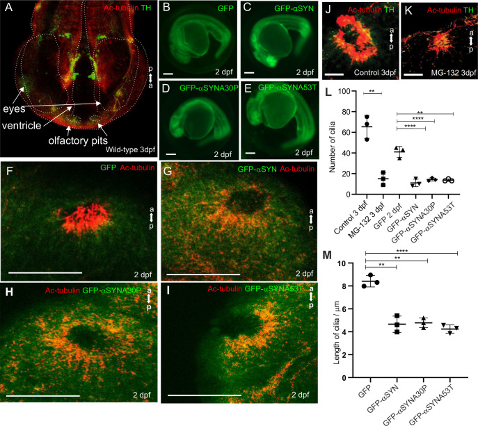 Olfactory cilia in zebrafish larvae are severely reduced in the presence of aggresomes. (A) The neuronal dopaminergic network in 3 dpf zebrafish forebrain viewed from the dorsal aspect, detected by TH-staining (green). Acetylated tubulin (red) stains axon tracts and cilia. (B–E) Overexpression of control GFP or α-syn, α-synA30P, α-synA53T familial mutations does not cause any anatomical defects in zebrafish larvae. (F) By 3 dpf extensive numbers of cilia are visible at the olfactory pit. (G–I) Overexpression of any of the three forms of α-syn (wild type, A30P or A53T) severely reduces numbers of cilia in the olfactory pit. Cilia length is also reduced. (J,K) Embryos treated with MG132 showed an extensive reduction in number of cilia. (L) Quantification of cilia numbers from above experiments (P=0.001, by one-way ANOVA, n=3). Cilia were counted from the confocal generated z-stacks, projected images of which are shown in this figure. (M) Quantification of length of cilia from F-I (P=0.0088, by one-way ANOVA, n=3). Scale bars: 100 μM.
