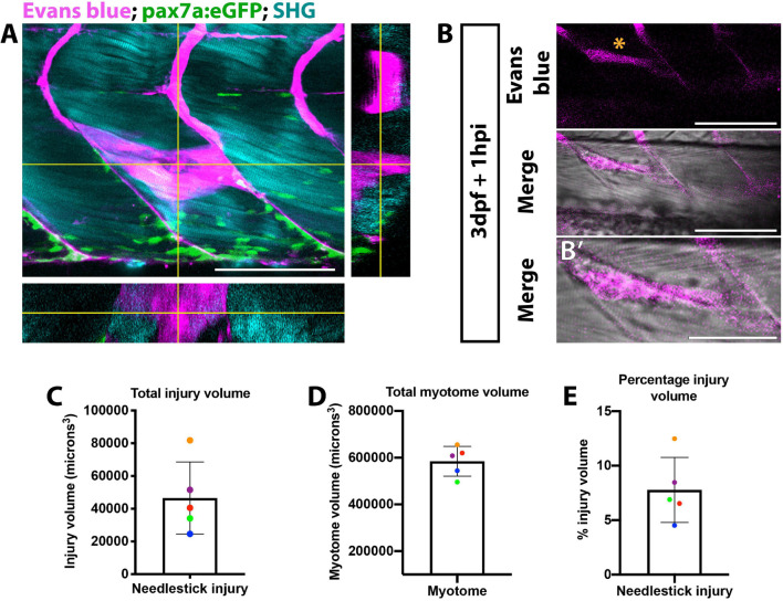 Visualization of muscle injury using Evans blue reveals low variability of injury size caused by needlestick. Evans blue labeling of damaged muscle (A,B) was visualized on a multiphoton microscope and localizes with perturbed myofibre morphology (B’) at needlestick wounds (asterisk) in 3 dpf larvae at 1 h post-injury. Maximum projection (A) with orthogonal sections in planes YZ (right) and XZ (bottom) showing Evans blue staining relative to myofibres (visualized by second harmonic generation; SHG) and pax7a:eGFP expressing muSCs. Volumetric measure of the (C) total myotome and (D) injured region were calculated by measuring injury size for each section, and the percentage injury size of the total myotome calculated (E). Each larvae (n = 5) has been color coded to highlight the variance in myotome and injury size. Error bars display standard deviation. Scale bars: 100 μm (A,B), 50 μm (B’).