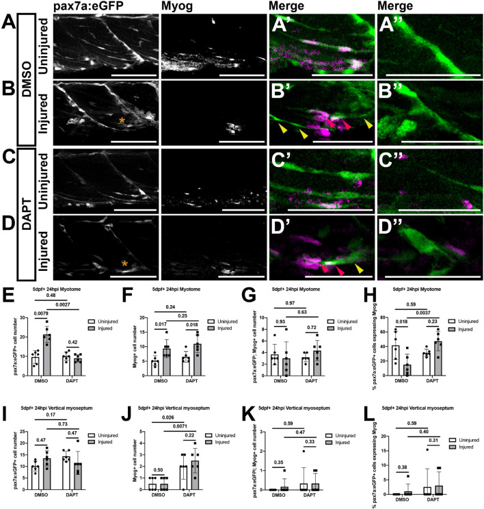 Inhibition of Notch signaling results in an increased differentiation of muSCs responding to injury. Projections of confocal stacks