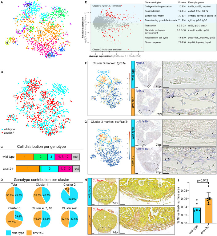 Fig. 4. prrx1b−/− hearts contain excessive amounts of pro-fibrotic fibroblasts. (A) tSNE map of the single-cell sequencing data as shown in Fig. 3C, indicating ten transcriptionally distinct cell populations. (B) tSNE map showing the contribution of wild-type cells (cyan) and prrx1b−/− cells (red). (C) Stacked bar graph showing the relative cell contribution to major clusters in wild-type and prrx1b−/− hearts. (D) Pie charts showing the contribution of wild-type and prrx1b−/− cells per cluster. (E) Differential gene expression analysis using the DESeq algorithm between fibroblast clusters 2 and 3. Enriched genes were selected for either cluster 2 or 3 with a P-value cut-off of <0.05 (red). Gene Ontology analysis was performed using the online tool DAVID. Gene and full Gene Ontology lists are provided in Tables S2 and S3. (F,G) Characterization of cluster 3. Left: tSNE maps visualizing log2-transformed read-counts for genes with high expression in the indicated cluster (circled). Middle: In situ hybridization for the cluster 3-enriched genes in wild-type and prrx1b−/− hearts at 7 dpi. Dashed line indicates injury border. Scale bars: 100 μm. Right: Magnifications of the boxed regions in the injury area with arrowheads pointing to cells with high expression. Scale bars: 25 μm. Three hearts analysed per condition. (H) Sirius Red staining showing collagen in red on sections of wild-type and prrx1b−/− hearts at 7 dpi. Right-hand panels show magnifications of the boxed regions in the sub-epicardial layer and further inside the injury area. Scale bars:100 μm (left); 50 μm (right). (I) Quantification of Sirius Red (collagen) staining in wild-type (n=6) and prrx1b−/− (n=7) hearts showing significantly more fibrosis in prrx1b−/− hearts inside and around the injury area (mean±s.d., P=0.012, unpaired t-test).