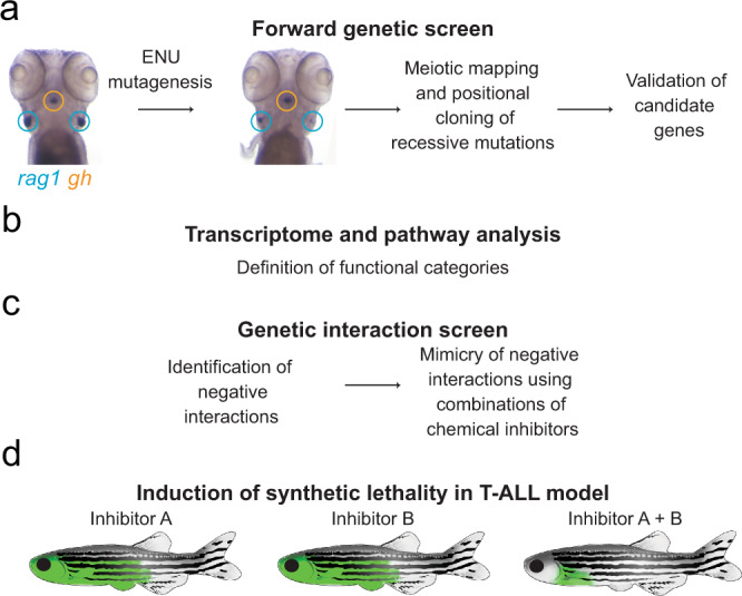 Fig. 1 a Identification of genetic variants perturbing T cell development through large-scale forward genetic screens in zebrafish larvae. b Delineation of the genetic network underlying the development of T cells by pairwise interaction analyses. c Phenocopy of a subset of genetic interactions using small molecule inhibitors. d Tumour treatment in an in vivo model of T-ALL based on the information obtained on synthetic lethal interactions.