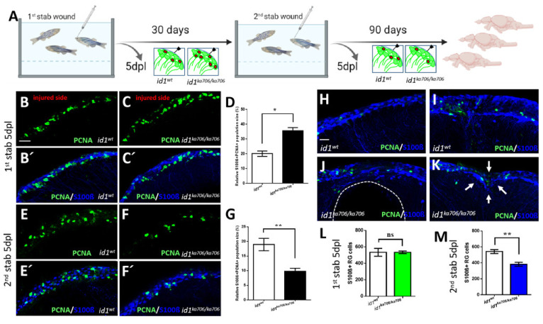 Figure 5 id1 is required to maintain the stem cell pool and the regenerative capacity of the telencephalon. (A) Experimental layout: 6-month-old adult id1ka706/ka706 fish (n = 25) and WT siblings (n = 25) were stabbed with a needle into the right hemisphere of the telencephalon. Fish (n = 2) of each group were sacrificed at 5 days post lesion (dpl) and the remaining fish were allowed to recover for one month before a second stab wound was inflicted. Five days after the second lesion, fish (n = 7) from each group were sacrificed for analysis. The remaining fish were kept for another 3 months before they were sacrificed (n = 16 for WT and n = 11 for id1ka706/ka706 mutants). Note that five mutant fish showed signs of suffering after the second wounding and were sacrificed before the end of the three months recovery. (B–C’, E–F’, H–K) Double immunohistochemistry with S100β (blue) and PCNA (green) antibodies was carried out to mark proliferating NSCs on telencephalic cross-sections from id1ka706/ka706 mutants and WT siblings at the different time points. (B–C’) After the first stab, id1ka706/ka706 mutants showed a higher number of proliferating NSCs. (D) Quantification of the population size of PCNA+/S100β+ cells in relation to the total number of NSCs (S100β+ cells) in WT and id1ka706/ka706 telencephalic cross-sections after the first stab wound. (E–F’) After the second injury, id1ka706/706 mutants showed less proliferating NSCs (PCNA+/S100β+ cells) compared to WT siblings. (G) Quantification of the population size of PCNA+/S100β+ cells in relation to the total number of NSCs (S100β+ cells) in cross-sections through WT and id1ka706/ka706 telencephala. (H–K) WT fish had repaired the lesion in the telencephalon 3 months after the second stab without signs of the injury (H) or with only mild signs of slight tissue disorganization (I). In contrast, id1ka706/ka706 mutants showed severe tissue lesions (J), such as a hole in the parenchyma of the telencephalon (dashed line) or dents in the parenchyma with tissue disorganization (K, white arrows). (L,M) Quantification of the NSCs (S100β+ cells) in the injured side after inflicting the first (L) and second (M) stab wound in WT and id1ka706/ka706 mutants showing a stepwise reduction of the number of NSCs. (Compare also with the increased number of NSCs in the uninjured mutant (Figure S3C)). Significance is indicated by asterisks: ns, not significant; * 0.01≤ p < 0.05; ** p < 0.01. Scale bars: 20 μm (B–C’,E–F’,H–K).