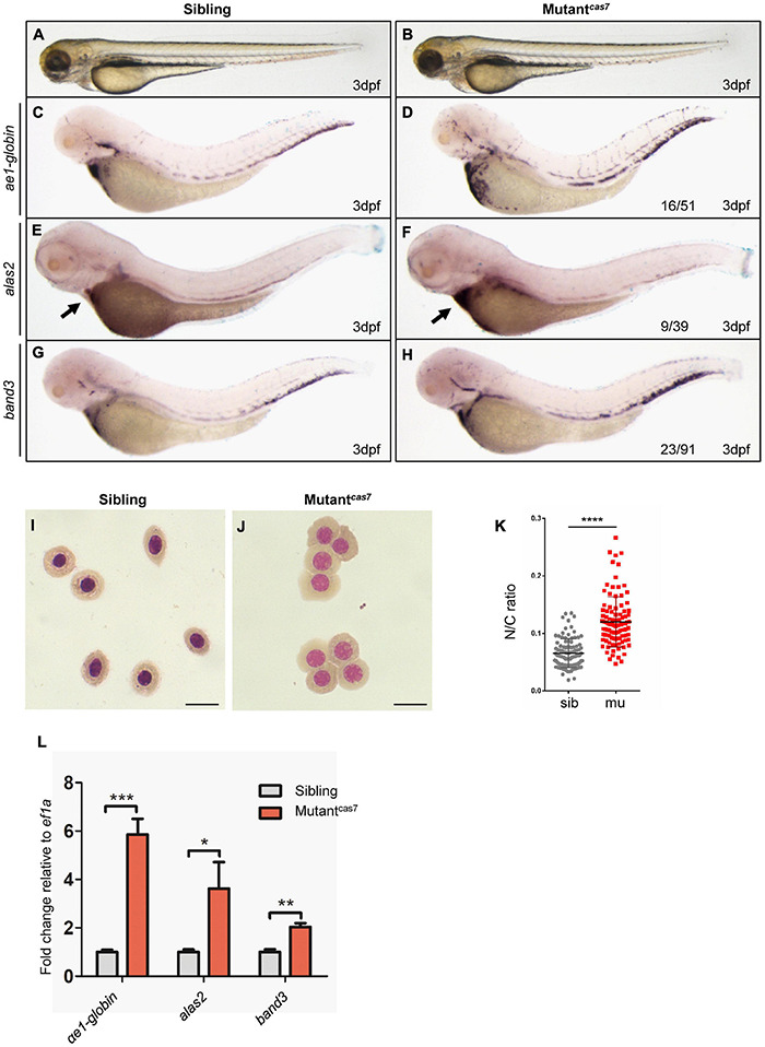 Erythroid maturation is disrupted in zebrafish mutantcas7. (A,B) Light microscope images of zebrafish wild-type (WT) sibling and mutantcas7 embryos at 3 dpf. (C–H) WISH analysis of ae1-globin (C,D), alas2 (E,F), and band3 (G,H) expression in sibling and mutantcas7 embryos at 3 dpf. After WISH and photographing, all embryos were extracted for genomic DNA and genotyped by sequencing, then the mutant percentage was evaluated. The number of embryos in a het-het incross clutch with the expression pattern is shown in the mutantcas7 column and corresponding percentages are listed inside each panel. Arrow in panel (E,F) indicates the alas2 staining in heart region. (I,J) Giemsa staining for erythrocytes at 4 dpf in sibling and mutantcas7. Relative to the number of orthochromatophilic erythroblasts, mutantcas7 displayed a marked increase in circulating polychromatophilic erythroblasts compared with sibling. Scale bars represent 10 μm. (K) Statistical analysis of the nucleus-to-cytoplasm (N/C) ratio in sibling and mutantcas7. N = 100, error bars represent SEM. ****p ≤ 0.0001. (L) The relative expression of αe1-globin, alas2, band3 in sibling and mutantcas7 embryos at 3 dpf. Error bars represent SEM. *p ≤ 0.05; **p ≤ 0.01; *** p ≤ 0.001.