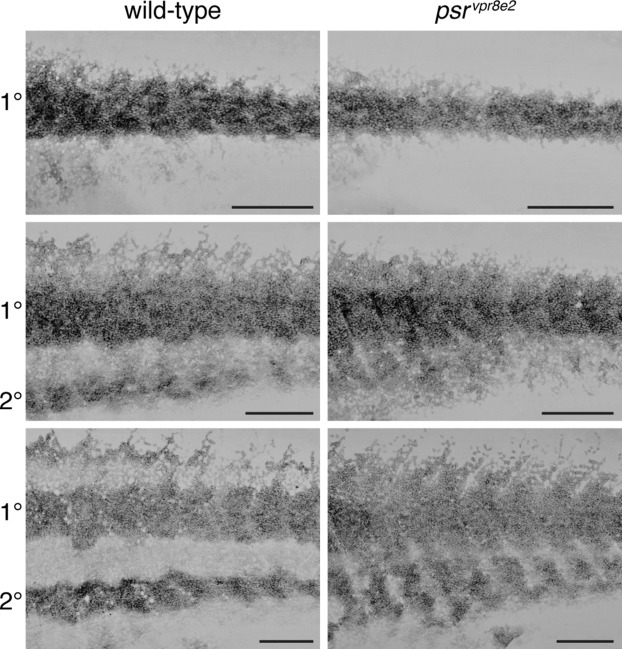 Fig. s3 Development of iridophore pattern in psr mutants. Iridophores were labeled with membrane-targeted mCherry driven by regulatory elements of purine nucleotide phosphorylase 4a (pnp4a:mem-mCherry), which is expressed strongly in these cells (Gur et al., 2020; Spiewak et al., 2018). Pixel values are inverted. Wild-type and psr mutant siblings were imaged repeatedly on successive days through completion of the adult pattern, and two representative individuals are shown here at each of three stages (n = 6 wild-type and 5 psr mutants total). In wild-type, densely packed iridophores formed a primary (1°) interstripe, with more loosely arranged iridophores developing dorsally and ventrally in prospective stripes (top, 9.2 SSL). A secondary (2°) interstripe subsequently formed ventrally (middle, 10.9 SSL) and began to form dorsally (bottom, 13.4 SSL). In psr mutants, densely packed iridophores typical of interstripes were spread more widely over the flank. Scale bars, 500 μM.