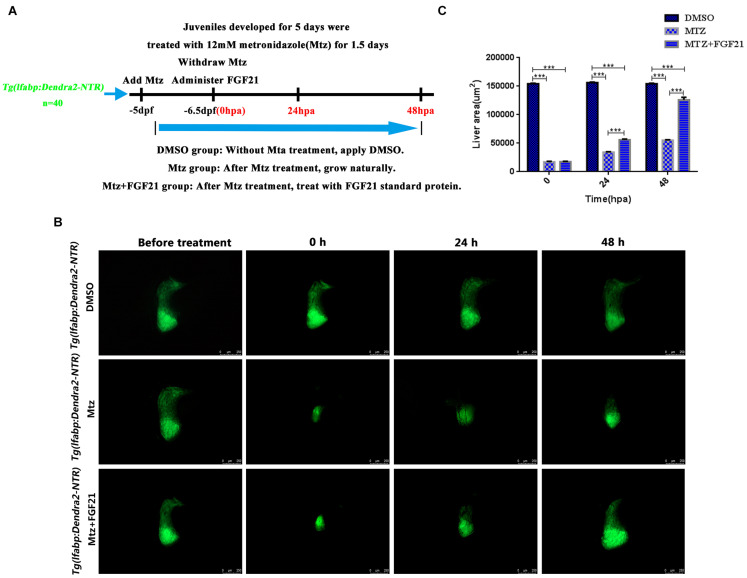 Fibroblast growth factor 21 improves liver regeneration after induced injury. After establishing the liver targeted-ablation model, FGF21 was administered and the treatment effect was evaluated. (A) The overall experimental process of FGF21 therapy for targeted liver ablation. (B) Liver regeneration at several time points after FGF21 treatment of the targeted ablated liver. (C) The histogram shows the quantification of the regenerated liver area assessed by ImageJ. DMSO group: without Mtz treatment, DMSO was applied. Mtz group: after Mtz treatment, the growth is natural Mtz+FGF21 group: after Mtz treatment, they were treated with FGF21 standard protein. Significance: ***p< 0.001 vs. DMSO group. Data are expressed as mean± standard error of mean (SEM) (n = 40 per group, repeat 3 times for each test). Scale bar = 250 μm.
