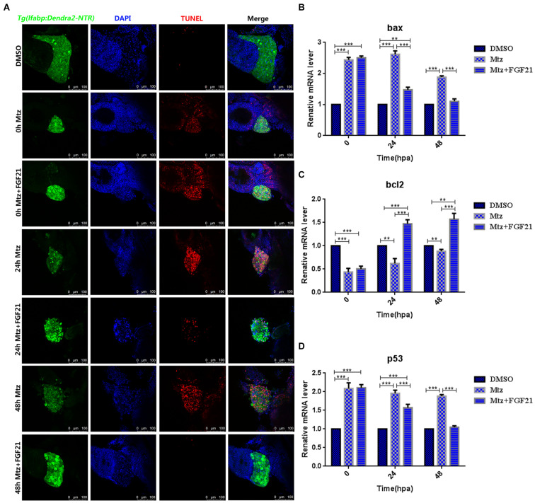 Fibroblast growth factor 21 inhibits liver cell apoptosis after injury. (A) TUNEL assay performed to assess the level of DNA damage in the damaged liver (nuclei, blue; damaged DNA, red; and liver cells, green). (B) RT-qPCR detection of bax mRNA of three groups at 0, 24, and 48 hpa. (C) RT-qPCR detection of bcl2 mRNA of three groups at 0, 24, and 48 hpa. (D) RT-qPCR detection of p53 mRNA of three groups at 0, 24, and 48 hpa. DMSO group: without Mtz treatment, DMSO was applied. Mtz group: after Mtz treatment, grow naturally. Mtz+FGF21 group: after Mtz treatment, treated with FGF21 standard protein. Significance: **p< 0.01, and ***p< 0.001 vs. DMSO group. Data are expressed as mean ± SEM (n = 40 per group, repeat 3 times for each test). Scale bar = 100 μm.