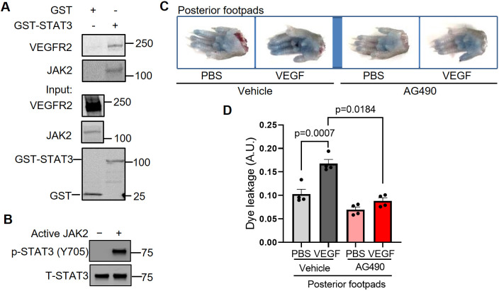 JAK2 phosphorylates STAT3 to transduce VEGF/VEGFR-2 signaling and promote vascular permeability. (A) To perform a STAT3 GST pull-down of VEGFR-2 and JAK2, lysates of HUVECs stimulated with serum for 30 min were used as prey. GST fusion protein STAT3 expressed in 293F cells was used as bait. GST alone served as a negative control. Binding experiments were analyzed by SDS-PAGE and visualized by immunoblotting. GST-STAT3 and GST were each detected using an anti-GST antibody. Three biological replicates were performed and depicted findings are representative. (B) JAK2 phosphorylates STAT3 in vitro. In vitro kinase assays were performed using purified human STAT3 protein and kinase active JAK2 protein. The results shown here are representative of two independent experiments. (C) Representative images of footpads from C57BL/6 WT mice treated with vehicle or JAK2 inhibitor AG490. Following tail vein injection with 1% Evans Blue dye, human VEGF-165 protein (2.5 μg/ml) or PBS vehicle was injected into the root of the footpad. After 30 min, the mice were euthanized and the footpads were excised. (D) Quantitation of Evans Blue dye leakage in C57BL/6 mice treated with vehicle or AG490. n=4 mice per group. Each mouse was injected with PBS in the right posterior footpad and VEGF in the left posterior footpad. Two biological replicates were performed and depicted findings are representative. Mean±s.e.m., one-way ANOVA followed by Bonferroni test.