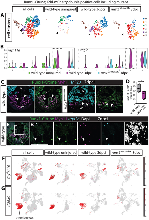 Fig. 7 (A) UMAP plot of Tg(BAC-runx1P2:Citrine;kdrl:Hsa.HRASmCherry) double-positive cells in the 3 dpci runx1 mutant as well as uninjured and 3 dpci wild-type cells. Arrowheads indicate the double-positive cluster 4 that is absent in the runx1 mutant. (B) Violin plot showing that the absent cluster 4 is the cluster most strongly expressing smooth muscle genes in the wild type after injury. (C) Immunohistochemistry for Citrine, Myh11 and MF20, showing reduced staining for Myh11 in the runx1 mutant wound at 7 dpci compared with the wild type. Arrowheads indicate overlap of Myh11 with Citrine in the endocardium. (D) Quantification of the area of Myh11 expression in the wound on sections between mutants and wild types. n=5, unpaired two-tailed t-test. *P<0.05. Box extends from the 25th to 75th percentiles and whiskers indicate minimum to maximum with all data points shown. (E,E′) In situ hybridisation for itga2b combined with immunohistochemistry for Citrine and Myh11 with nuclear marker Dapi. Arrowheads indicate Myh11-expressing blood cells that express the thrombocyte marker itga2b. (F,G) UMAP plot of all cells confirms expression of myh11a in the itga2b-positive thrombocyte cluster. v, ventricle; w, wound. Scale bars: 100 μm.