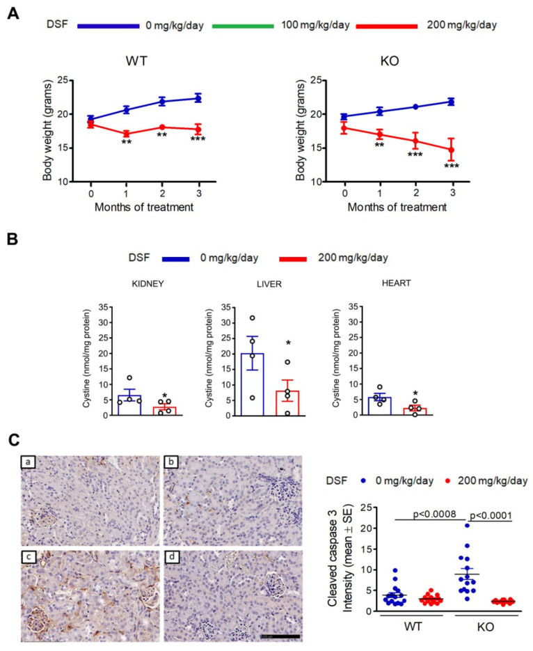 Figure 3 Short-term treatment with high DSF dose. Two-month-old mice were fed on standard or DSF-supplemented diet at an estimated dose of 200 mg/kg of body weight/day. (A) Body weight in animals fed on standard or DSF-supplemented diets for three months. Data are shown as mean ± SEM; n = 9 WT and 4 KO mice; ** p < 0.005, *** p < 0.0005 compared to untreated animals. (B) Cystine content in kidneys, liver, and heart of KO animals sacrificed at 5 months of age (n = 4 mice per group). Values are indicated as mean ± SEM; * p < 0.05 compared to untreated mice. (C) Representative immunohistochemistry images stained with anti-cleaved caspase-3 antibodies in kidneys obtained from WT (a,b) and KO (c,d) mice that were fed on standard (a,c) or DSF-supplemented (b,d) diets. Scale bar: 100 µm. The graph shows the mean cleaved caspase-3 intensity measured on five separate slides per animal (n = 3 mice per group).