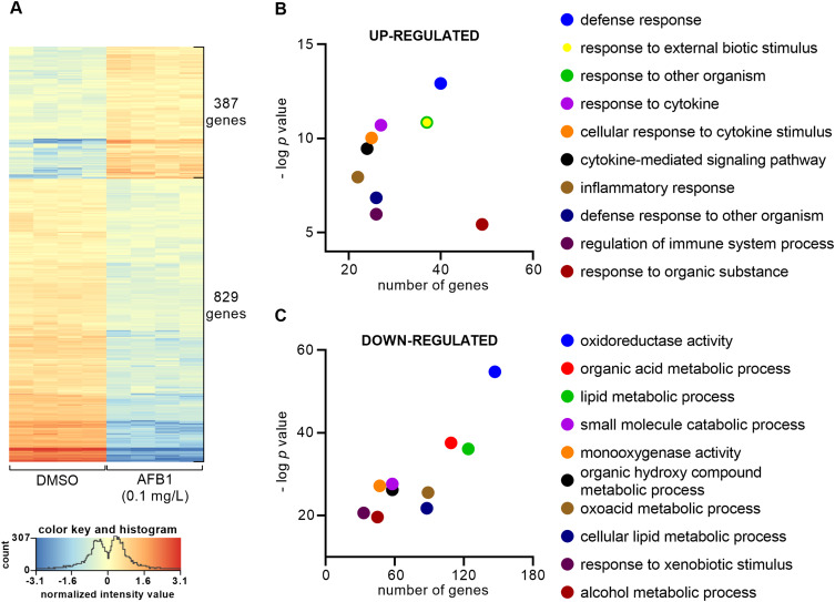 Fig. 2 Embryonic exposure to AFB1 results in global gene expression changes in zebrafish larvae. (A) Heat map showing the differentially expressed genes between the control (DMSO) and the AFB1-exposed (0.1 mg/L) 120 hpf larvae. Data represent the normalized gene expression values of the four independent biological replicates per treatment. (B) Scatter plot showing the top 10 most significantly over-represented Gene Ontology terms among up-regulatedgenes in AFB1-exposed 120 hpf larvae. Y-axis represents the negative log (base 10) of the term significance (p-value). X-axis represents the number of genes associated with the term. (C) Scatter plot showing the top 10 most significantly over-represented Gene Ontology terms among down-regulated genes in AFB1-exposed 120 hpf larvae. Y-axis represents the negative log (base 10) of the term significance (p-value). X-axis represents the number of genes associated with the term.