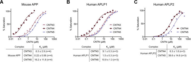 Validation of CNTN–amyloid interactions by biolayer interferometry. The E1 domains of APP, APLP1, and APLP2 were biotinylated in a 1:1 M ratio, immobilized onto streptavidin sensors, and titrated against varying concentrations of the FN1–FN3 region of selected CNTN proteins. One representative experiment for each series is shown in A–C, whereas a summary of the affinities measured for at least three biological replicates is shown below each curve. The plots were normalized to the maximal response. APLP1, amyloid beta precursor like protein 1; APLP2, amyloid beta precursor like protein 2; APP, amyloid precursor protein; CNTN, contactin; FN1, first FN repeat; FN3, third FN repeat.