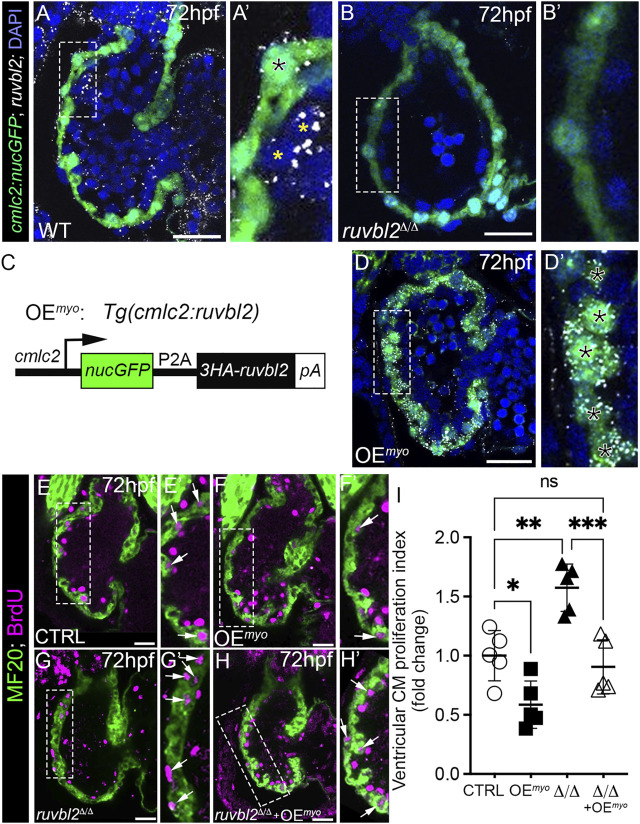 Myocardial expression of Ruvbl2 rescues cardiomyocyte hyperproliferation in ruvbl2 Δ/Δ mutants. (A–B′) Confocal single plane optical sections of endogenous ruvbl2 expression (white signal) relative to myocardium (green signal) processed by RNAscope fluorescent in situ hybridization and immunohistochemistry for GFP in wild-type (A, A′; n = 4) or ruvbl2 Δ/Δ (B, B′; n = 4) Tg (cmlc2:nucGFP) embryos with DAPI nuclei counterstaining (blue signal). Boxed regions in A and B are shown at higher magnifications in A′ and B′, respectively. The black asterix in A′ denotes myocardial ruvbl2 expression, while yellow astrices mark presumptive endocardial ruvbl2 expression. (C) Schematic of the transgene generated to achieve constitutive ruvbl2 overexpression in the myocardium (OEmyo). (D) Confocal single plane optical section of the ruvbl2 expression domain (white signal) relative to myocardium (green signal) processed by RNAscope fluorescent in situ hybridization and immunohistochemistry for GFP in Tg (cmlc2:ruvbl2) Tg (cmlc2:nucGFP) double transgenic embryos (n = 4) with DAPI nuclei counterstaining (blue signal). Boxed region in D is shown at higher magnifications in D′. Black asterices in (D′) denote myocardial ruvbl2 expression, which when compared to wildtype (A,A′) is substantially higher. (E–H′) Single plane confocal images of wildtype control (E,E′), OEmyo (F,F′), ruvbl2 Δ/Δ (G,G′), ruvbl2 Δ/Δ with OEmyo (H,H′) hearts double immunostained to detect cycling (BrdU+) cardiomyocytes (MF20+) at 72 hpf. Boxed regions in (E–H) are magnified in (E′–H′) with white arrows highlighting double positive cells. Sample sizes are n = 6 for all groups. (I) Quantification of fold change in cardiomyocyte proliferation indices between cohorts. Means ± s.d are shown. ns; not significant; *p < 0.05, **p < 0.01, ***p < 0.001. Scale bars: 25 μm.