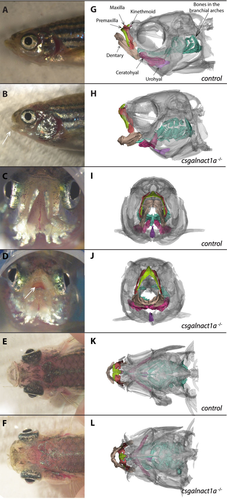 Bright field images of zebrafish heads (A-F) and corresponding 3D reconstructions of microCT scans (G-H). Different skeletal elements are highlighted with colors. Compared to control adults (A,C,E,G,I,K), csgalnact1a-/- adults (B,D,F,H,J,L) present a shortened jaw (arrow B) resulting in an open mouth phenotype (arrow D). In dorsal view the protruding eyes of csgalnact1a-/- adults are apparent (F).