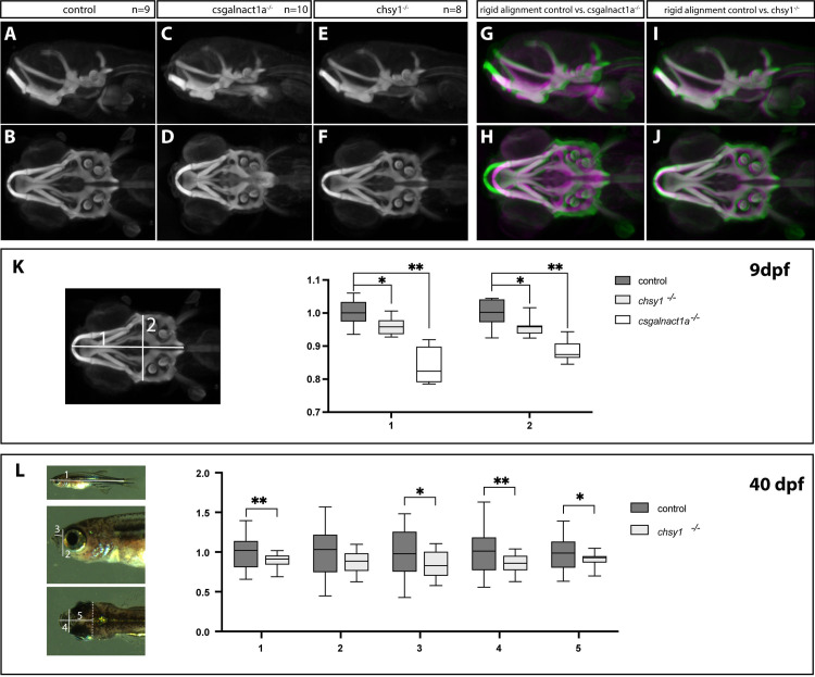 Maximum projections of average patterns generated from control, csgalnact1a-/- and chsy1-/- alcian blue stained larvae at 9 dpf show the pharyngeal cartilage structures in a ventral view (A-F). Maximum projections for each mutant (magenta) aligned to the control (green) are displayed using a rigid transformation (G-J). Measurements of the length and width of the head skeleton of 9 dpf larvae were performed on maximum projection images as shown in the image to the right (K) and plotted as a factor of control larvae (n = 8 for all genotype groups) (K). csgalnact1a-/- and chsy1-/- larval head skeleton is significantly smaller compared to control (K). Measurements of the standard body length (1) and different other measurements of the head (2–5) are indicated on images of 40 dpf old juvenile fish (L). chsy1-/- juveniles are significantly shorter and have a smaller head compared to control larvae (chsy1-/- n = 17, control n = 27) (L). Statistical significance is indicated by * for p-values <0.05 and ** for p-values <0.005.