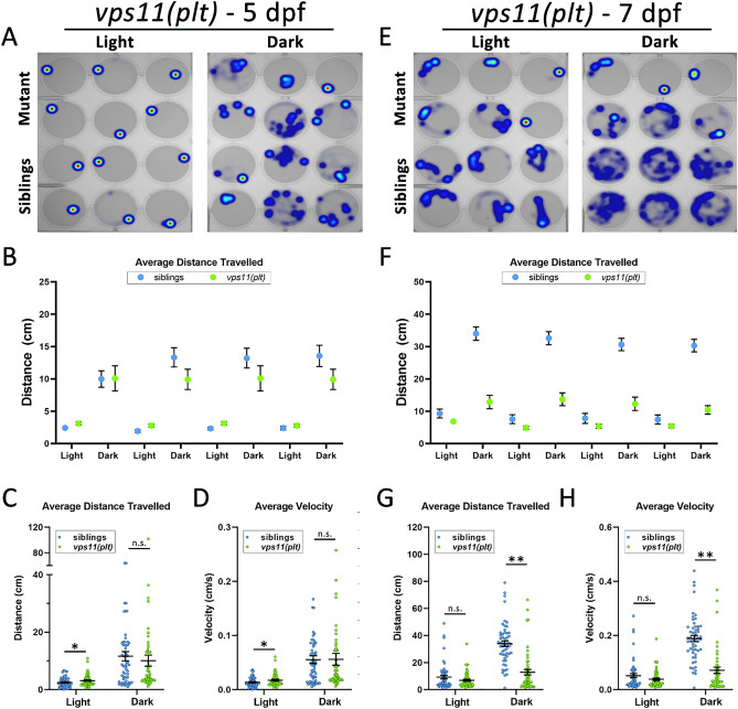 vps11(plt) mutants show normal distance travelled and velocity at 5dpf and significantly reduced distance travelled and velocity at 7dpf during alternating cycles of light and dark. (A) Representative heat maps of total distance moved by individual larvae at 5dpf (vps11(plt) mutants = top two rows; siblings = bottom two rows) during a 3-min period of light and dark. (B) Graph representing average distance travelled in 4 alternating light–dark cycles of 3 min each (sibling larvae in blue; vps11(plt) mutants in green). (C) Graph representing average distance travelled in light and dark periods. (D) Graph representing average velocity of sibling larvae and vps11(plt) in light and dark periods. n = 60 sibling and 60 vps11(plt) larvae at 5 dpf. (E) Representative heat maps displaying total distance moved by individual larvae at 7dpf (vps11(plt) mutants = top two rows; siblings = bottom two rows) during a 3-min period of light and dark. (F) Graph representing average distance travelled by larvae in 4 alternating light–dark cycles of 3 min each (sibling larvae in blue; vps11(plt) mutants in green). (G) Graph representing average distance travelled in light and dark periods. (H) Graph representing average velocity of sibling larvae and vps11(plt) in light and dark periods. n = 54 sibling and 52 vps11(plt) larvae. *P < 0.05, **P < 0.01. Error bars indicate SEM.